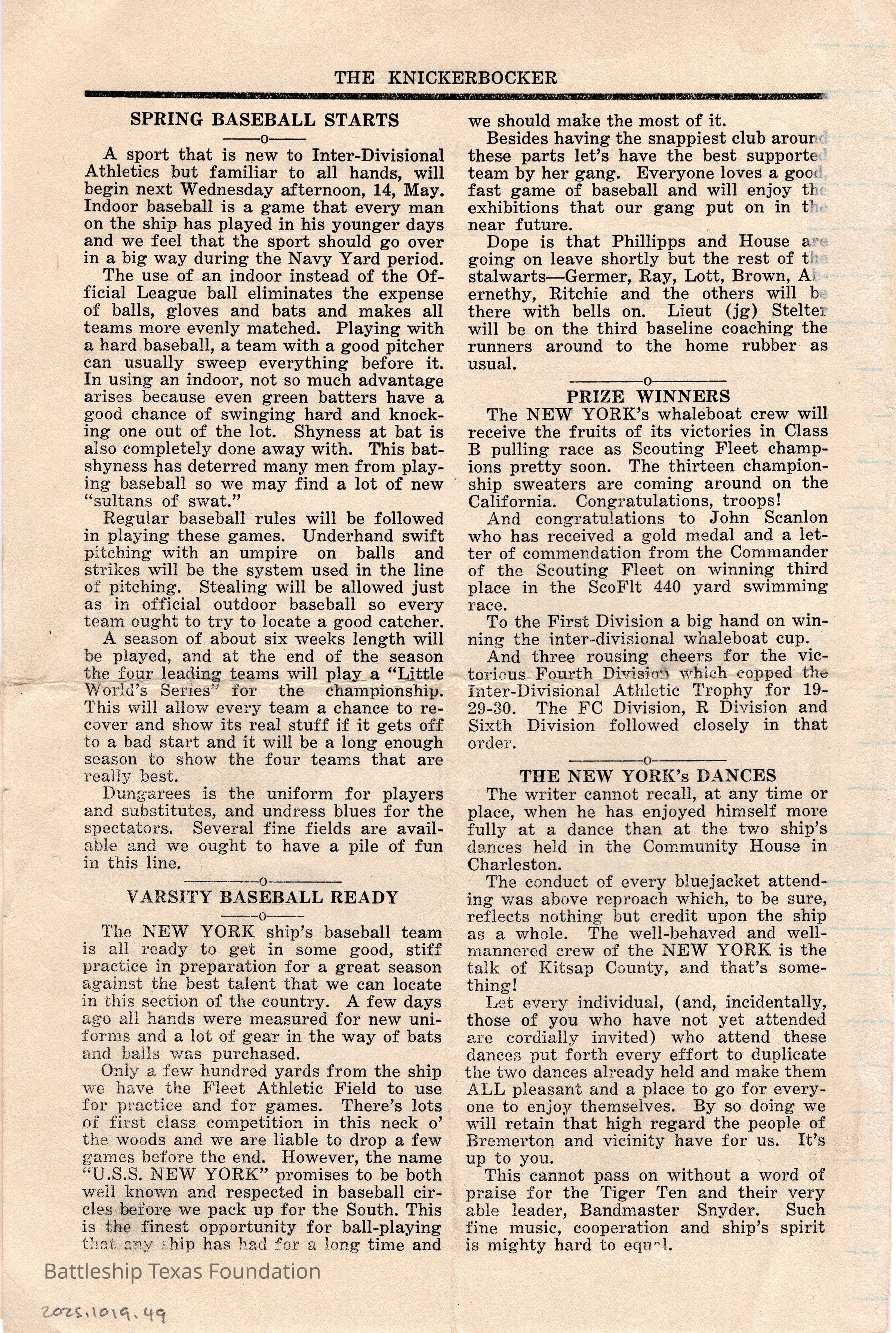 “The Knickerbocker” was a biweekly paper, started in 1920, and published jointly by the midshipmen and enlisted men of Battleship New York. The paper was published until 1936, running a total of sixteen volumes, with some special issues.Collection