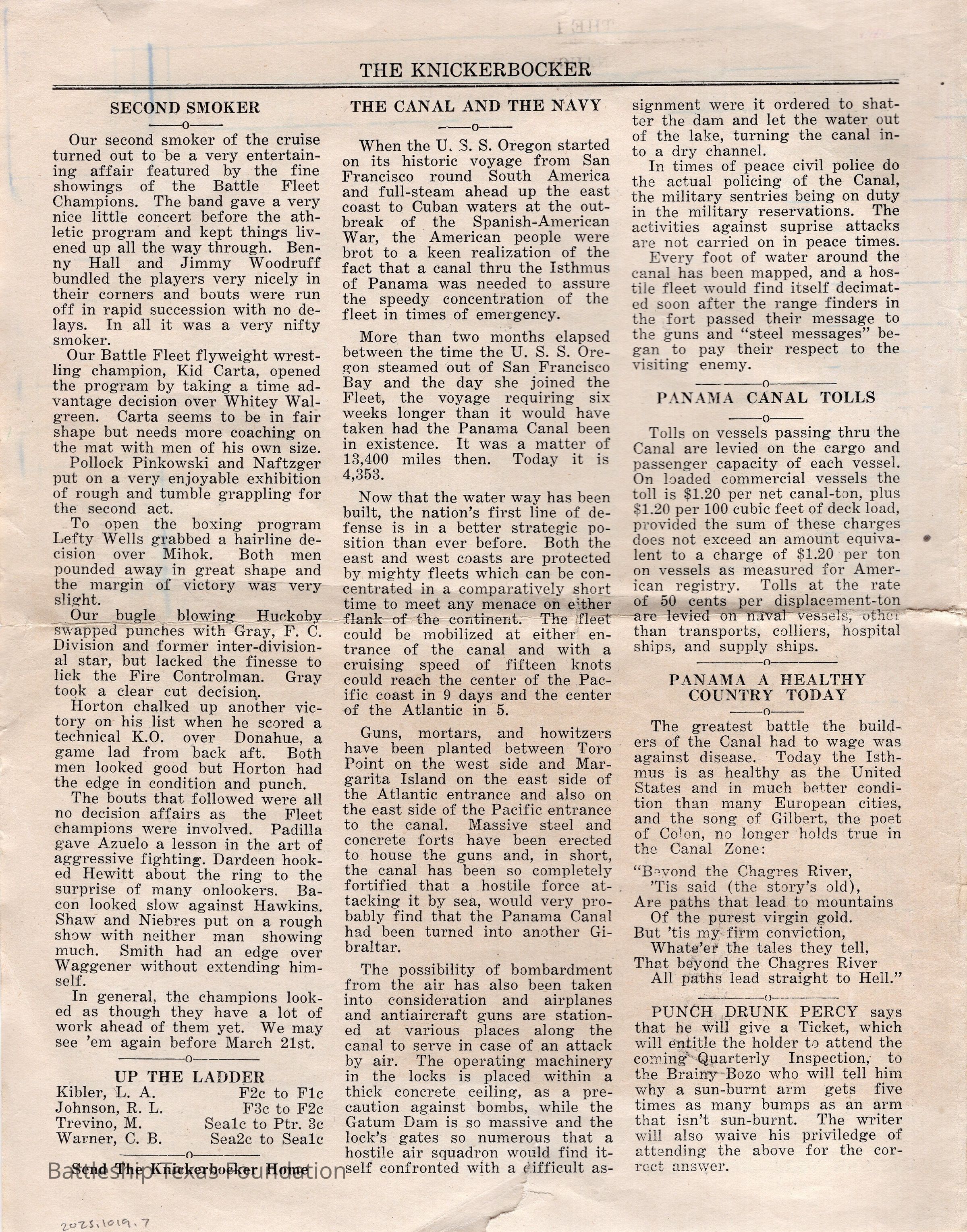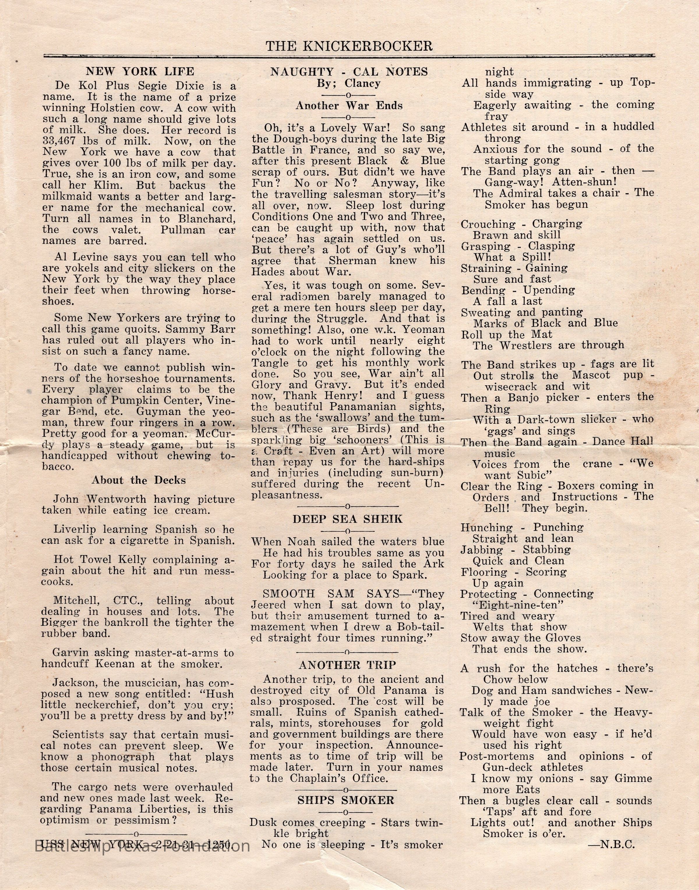 “The Knickerbocker” was a biweekly paper, started in 1920, and published jointly by the midshipmen and enlisted men of Battleship New York. The paper was published until 1936, running a total of sixteen volumes, with some special issues.Collection