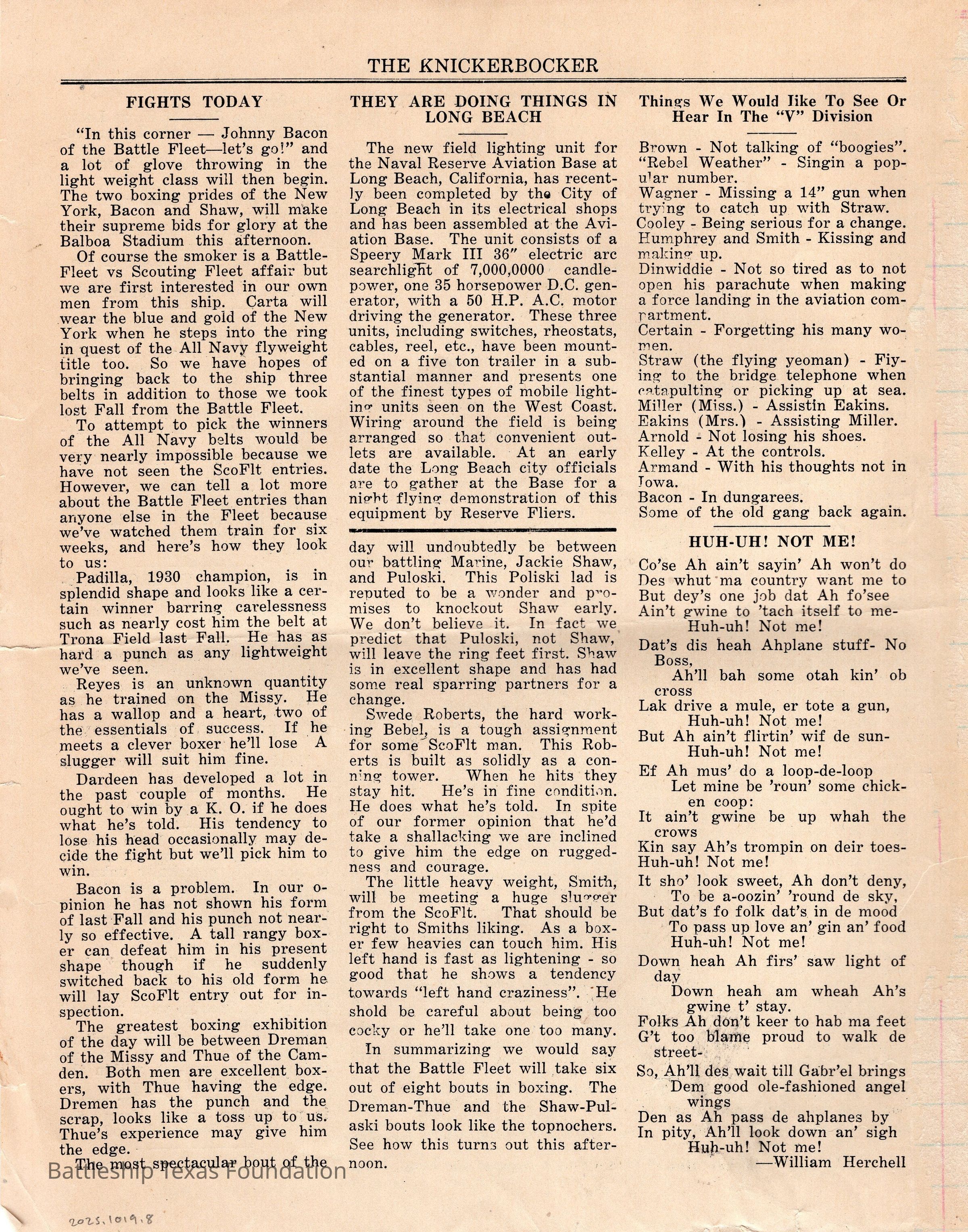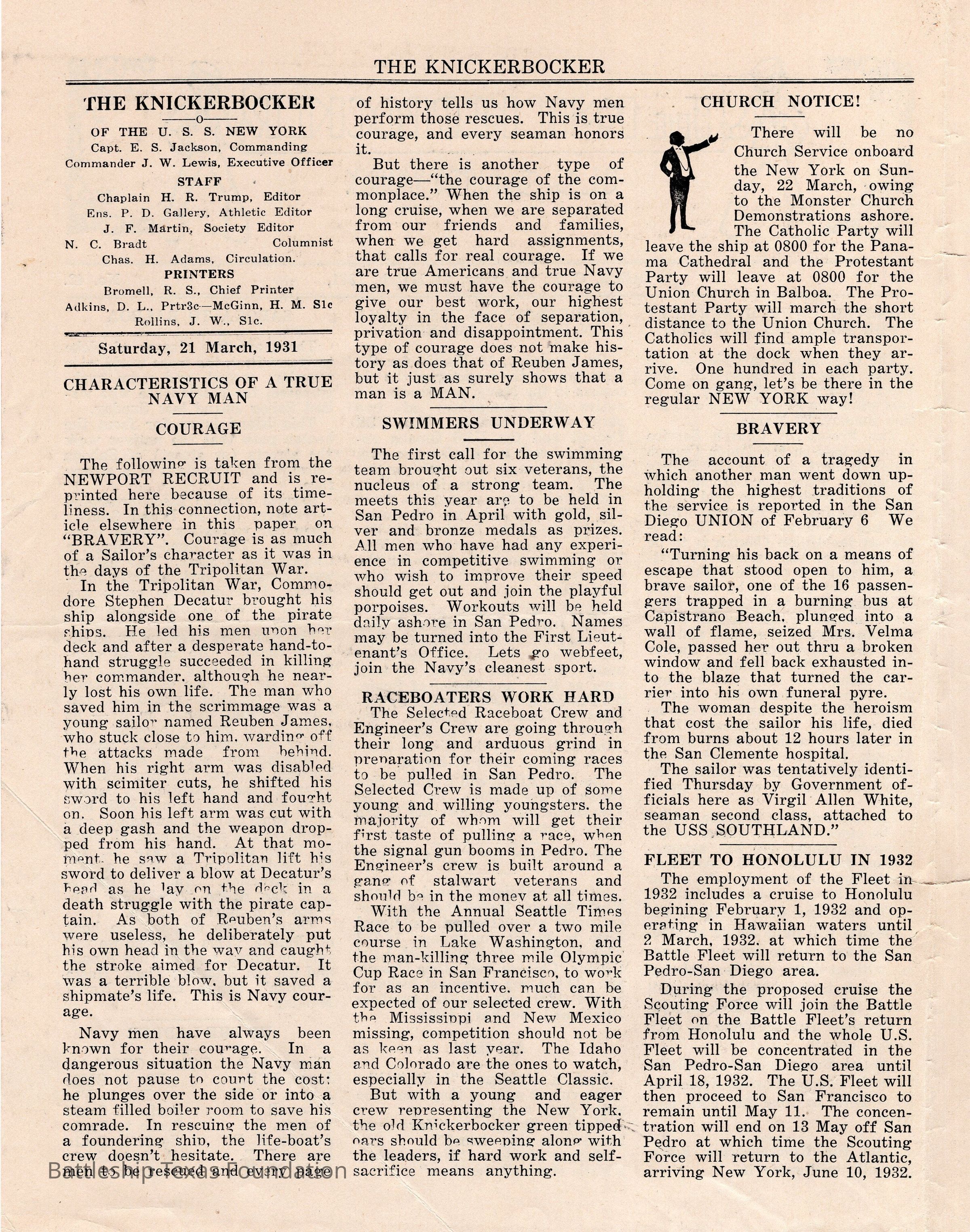 “The Knickerbocker” was a biweekly paper, started in 1920, and published jointly by the midshipmen and enlisted men of Battleship New York. The paper was published until 1936, running a total of sixteen volumes, with some special issues.Collection