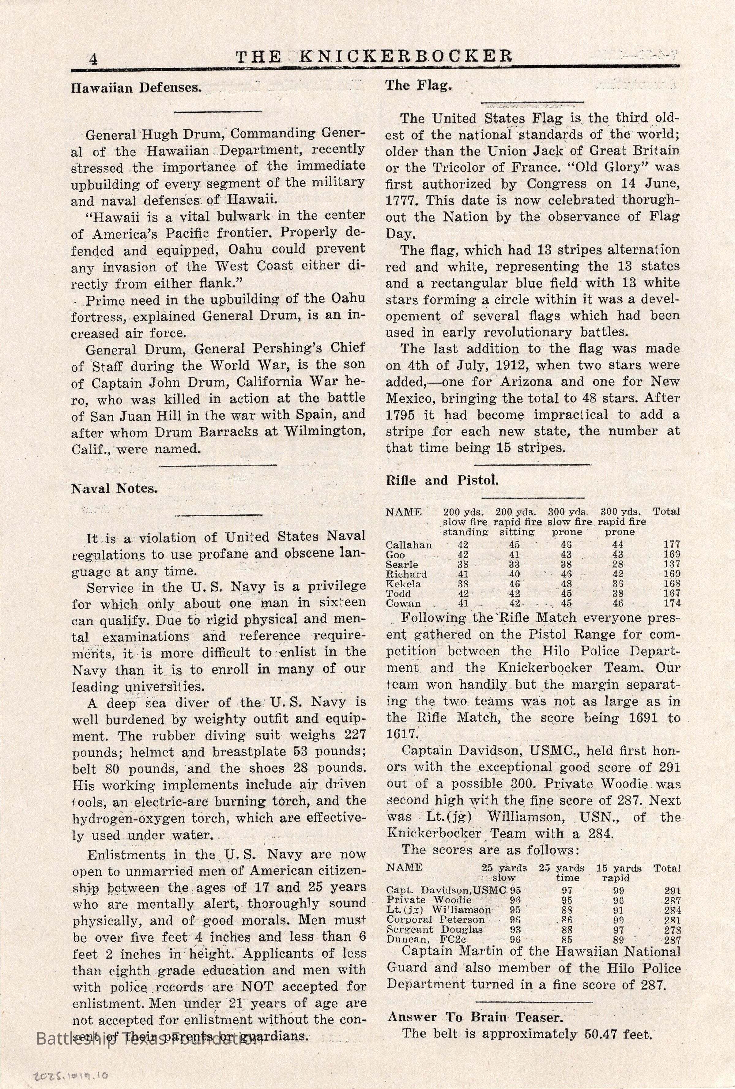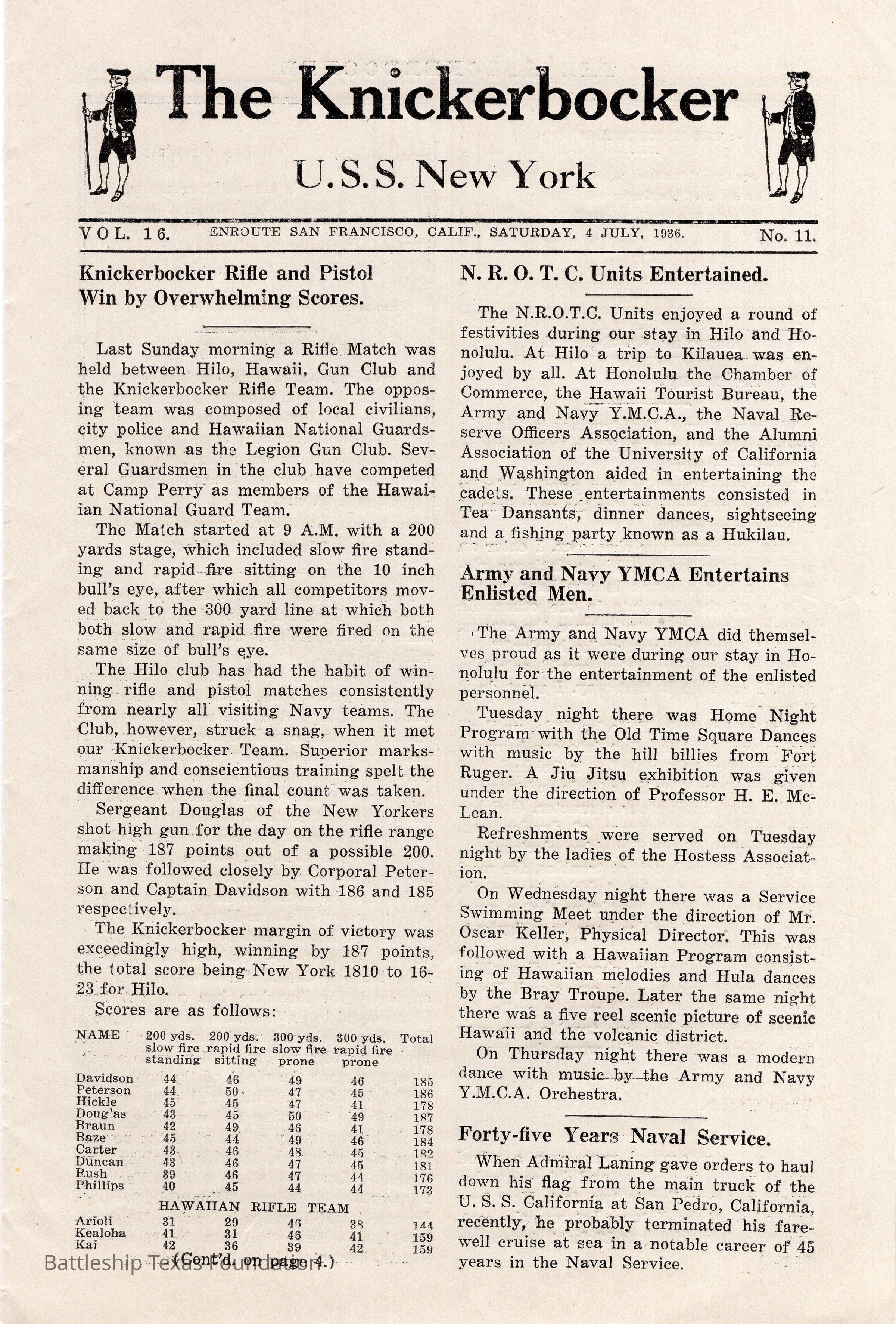 “The Knickerbocker” was a biweekly paper, started in 1920, and published jointly by the midshipmen and enlisted men of Battleship New York. The paper was published until 1936, running a total of sixteen volumes, with some special issues.Collection