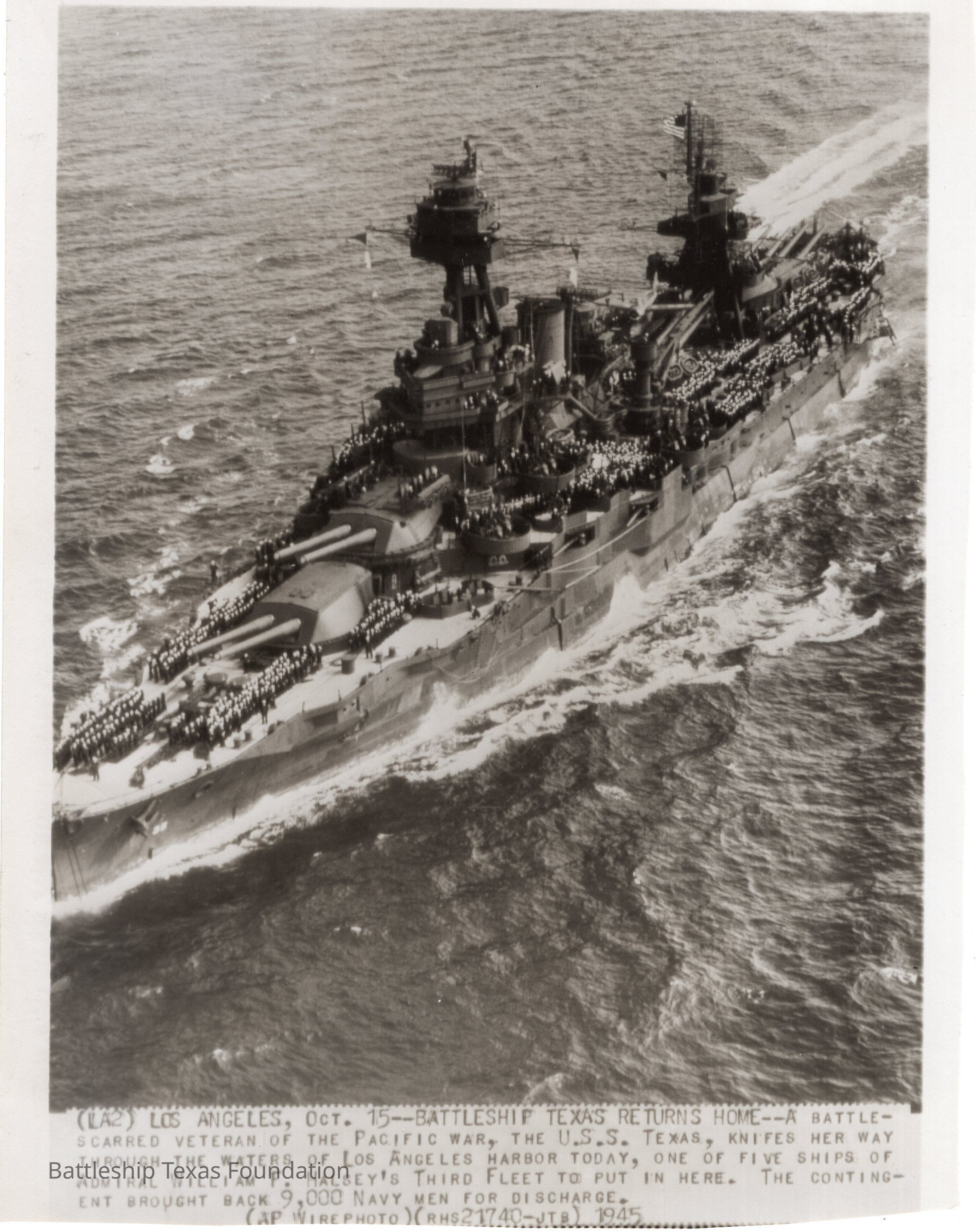 Photo of Texas on October 15, 1945, as she returns to the United States. Caption describes Texas knifing her way through the Los Angeles waters.Context
