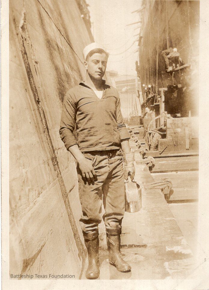 Features sailor in blues standing at base of dry dock. Texas visible in background on the right behind “Koch”Context
