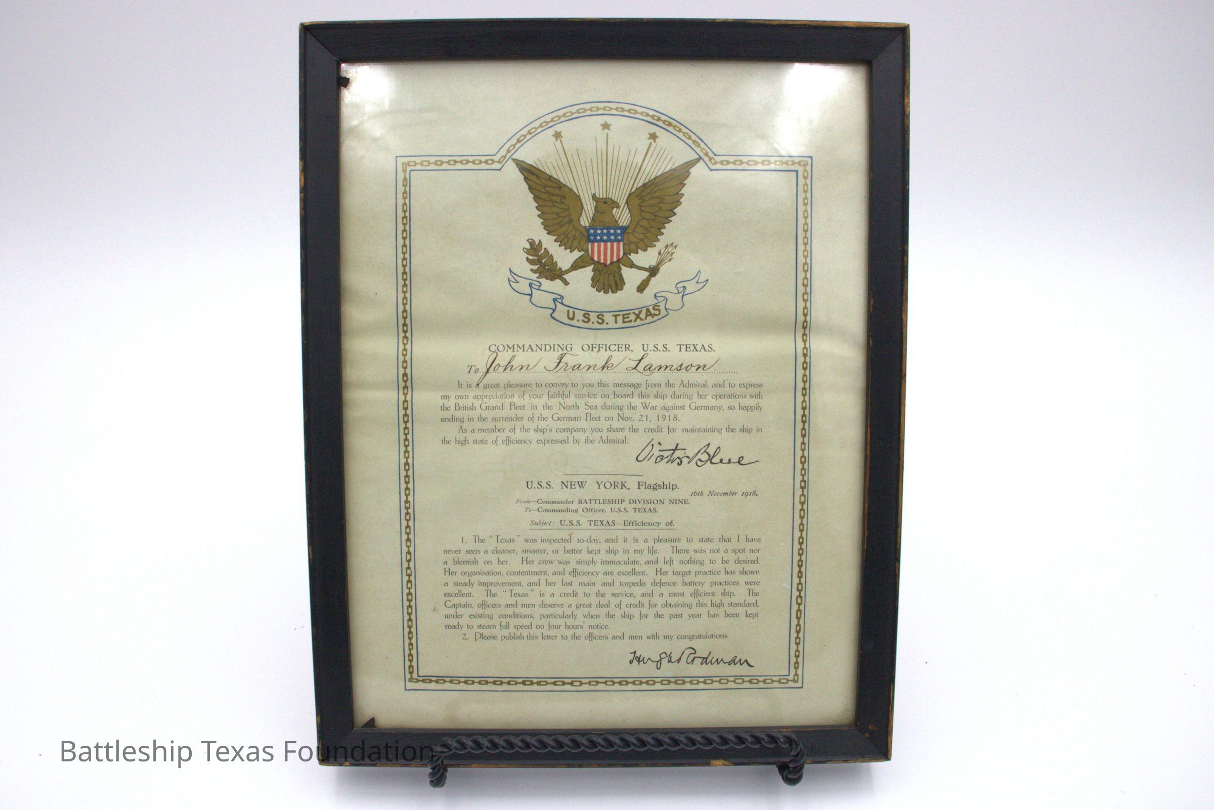This letter was given to every officer and crew member of Battleship Texas at the conclusion of overseas service.Collection
