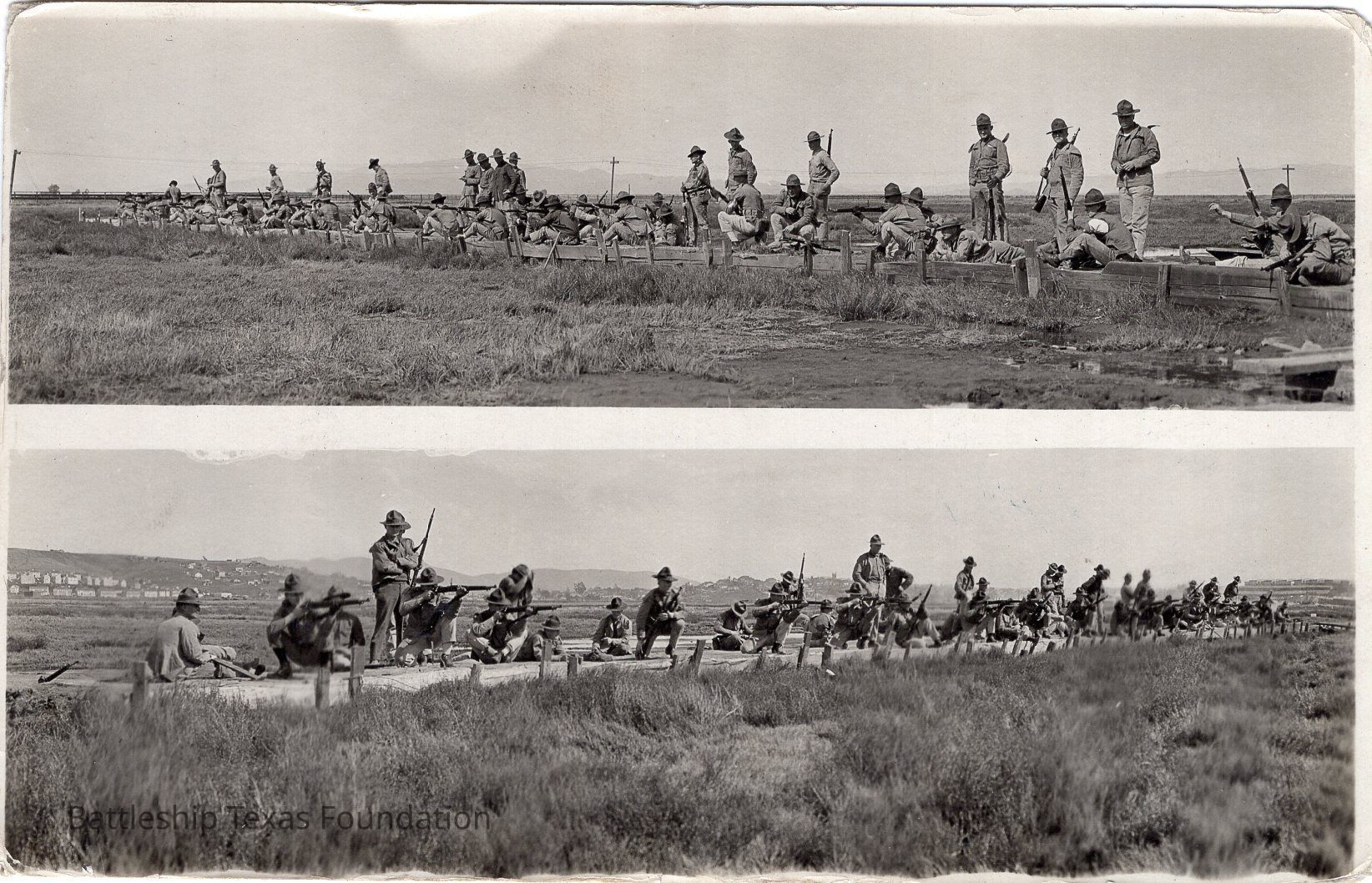 Two slim photos on top of one another of rows of men at gun range in a field.Context