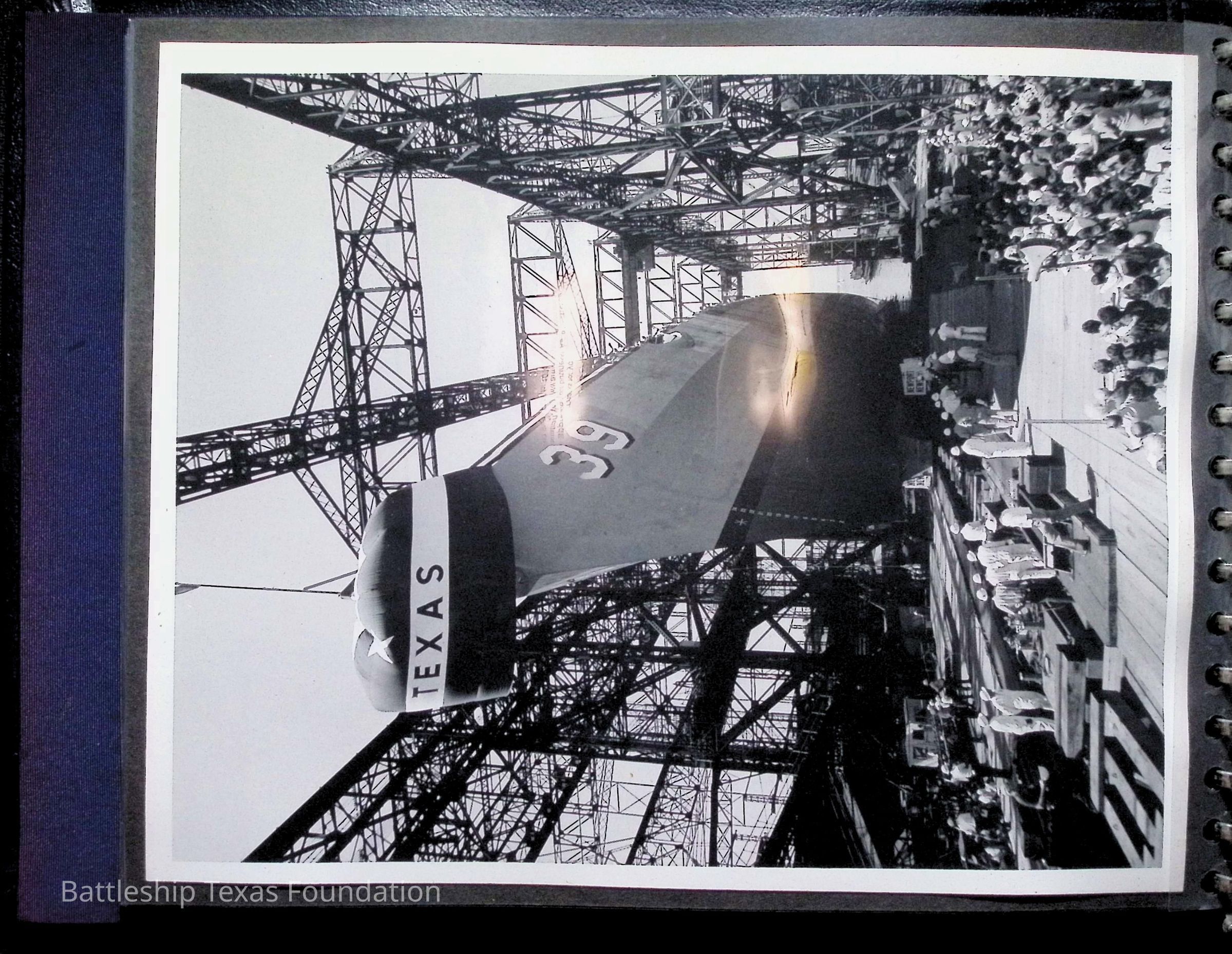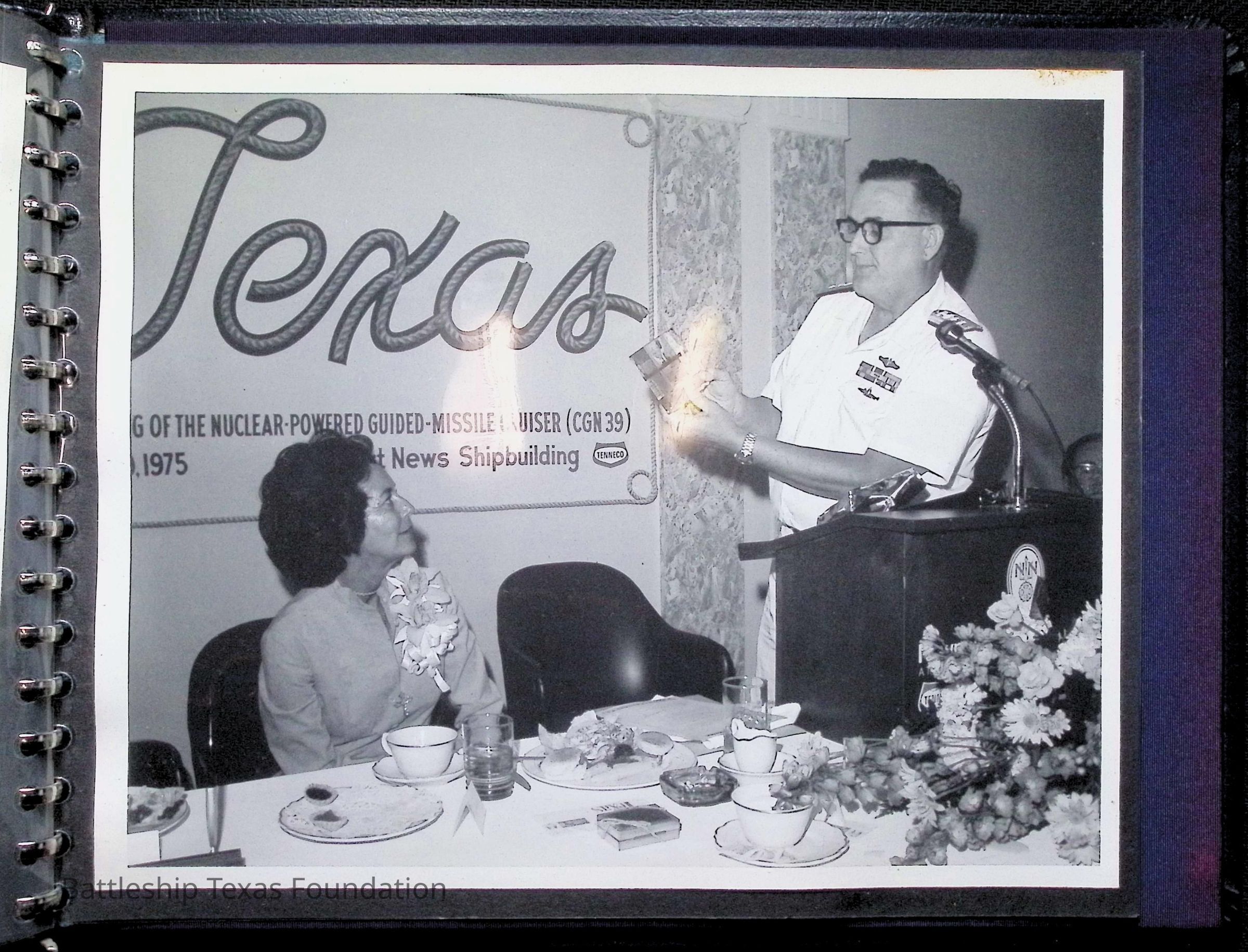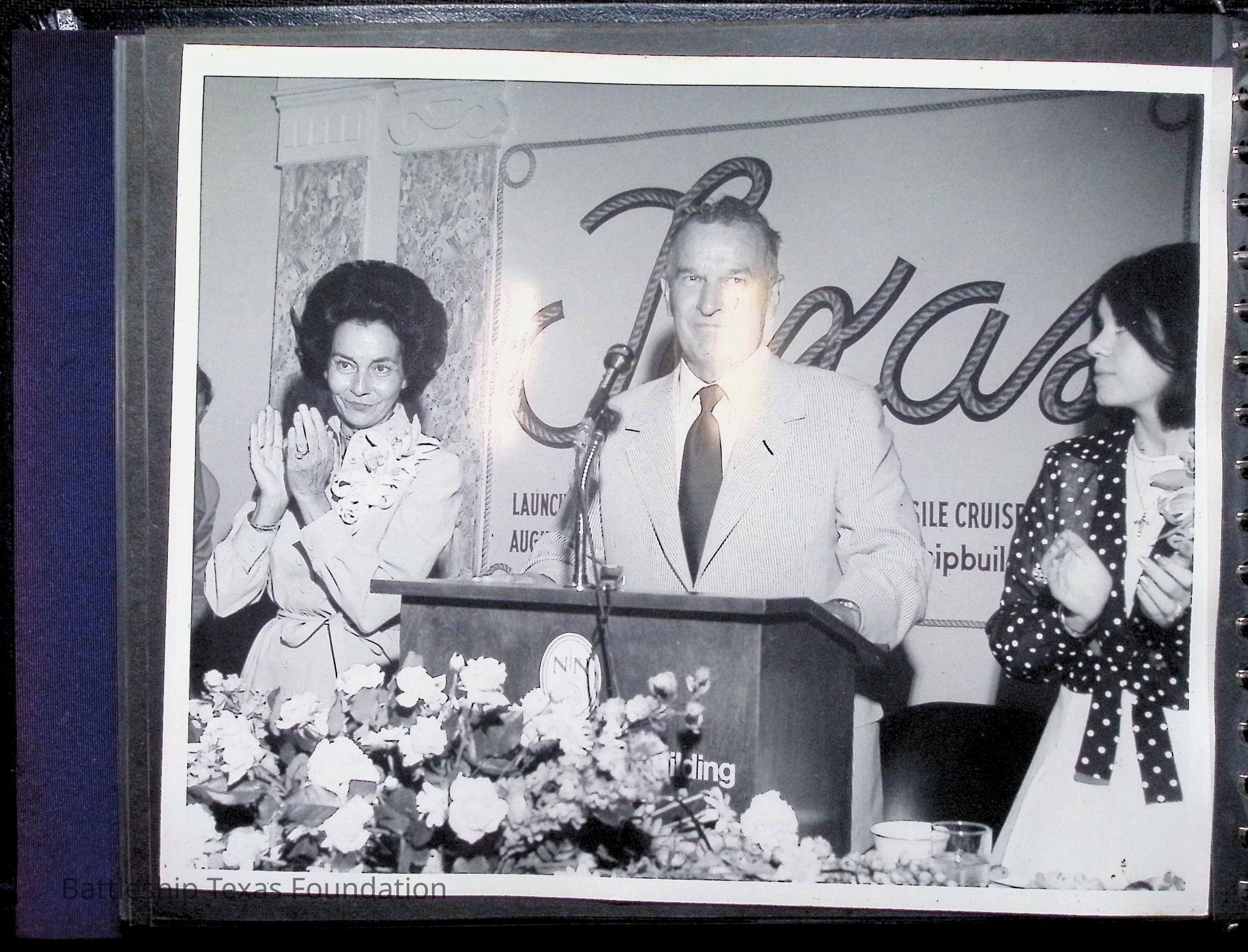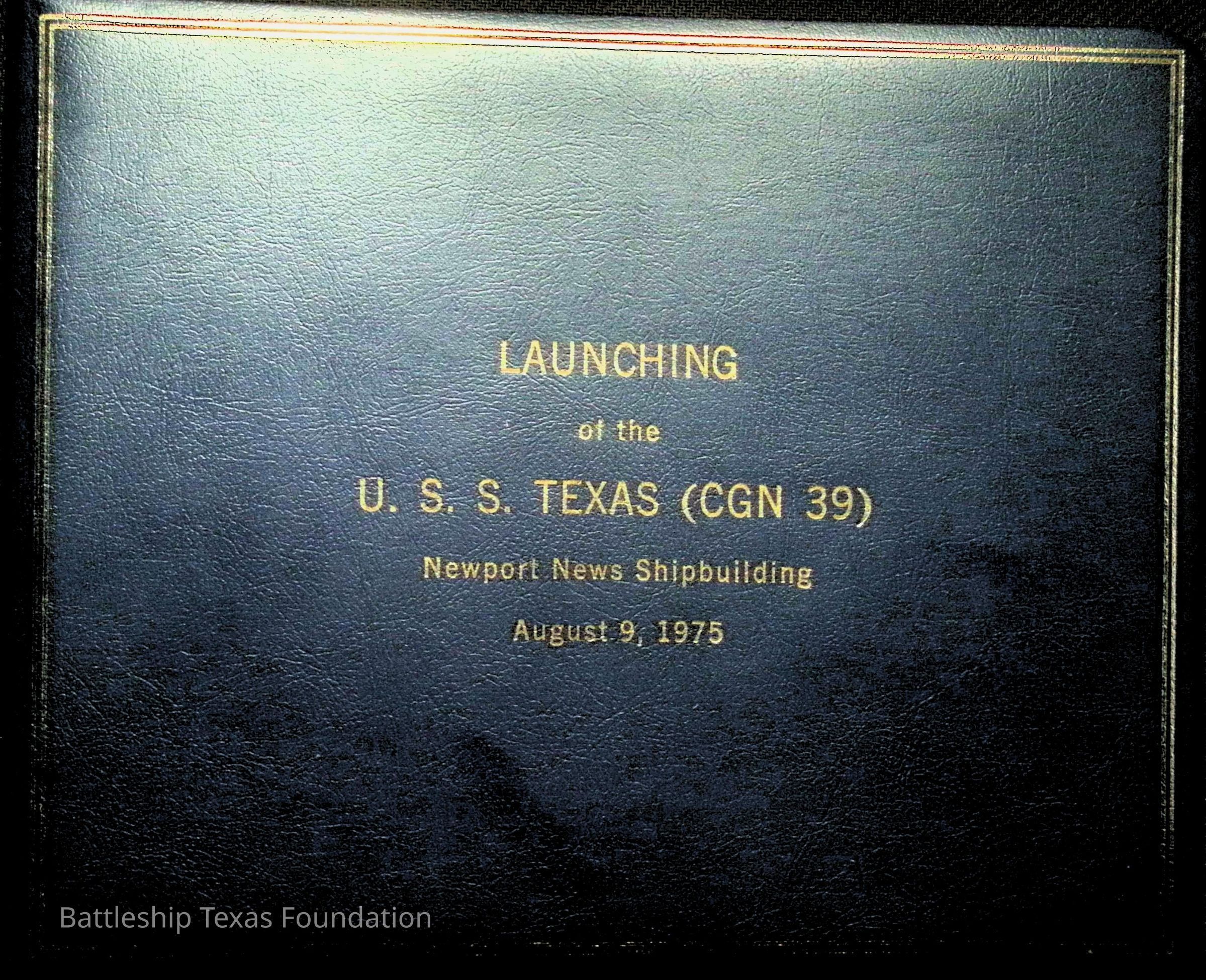 Photo album for the launching of the cruiser USS Texas at Newport News Shipbuilding on August 9, 1975. Contains one picture per page, twelve total, all bound in a dark leather cover. All photos are from the launch of the ship, and the surrounding events.Context