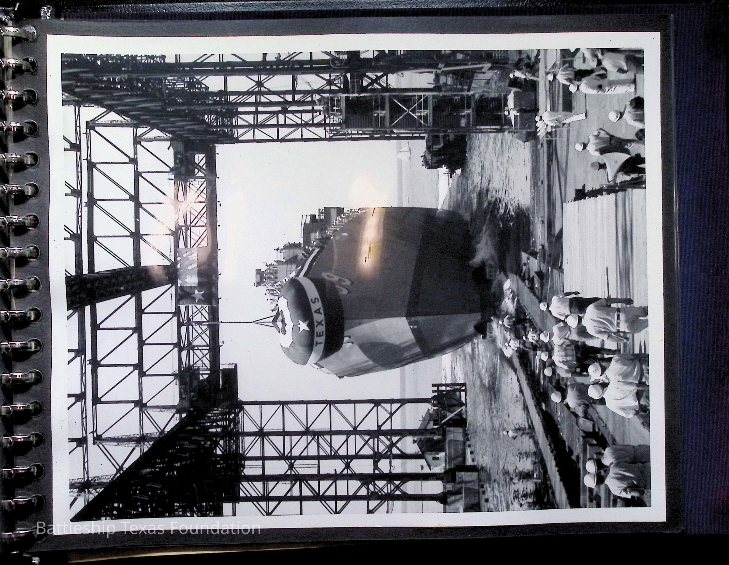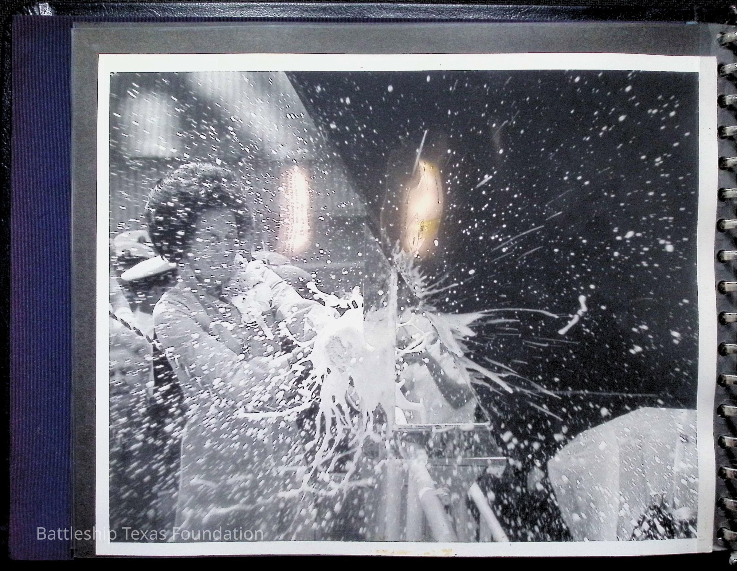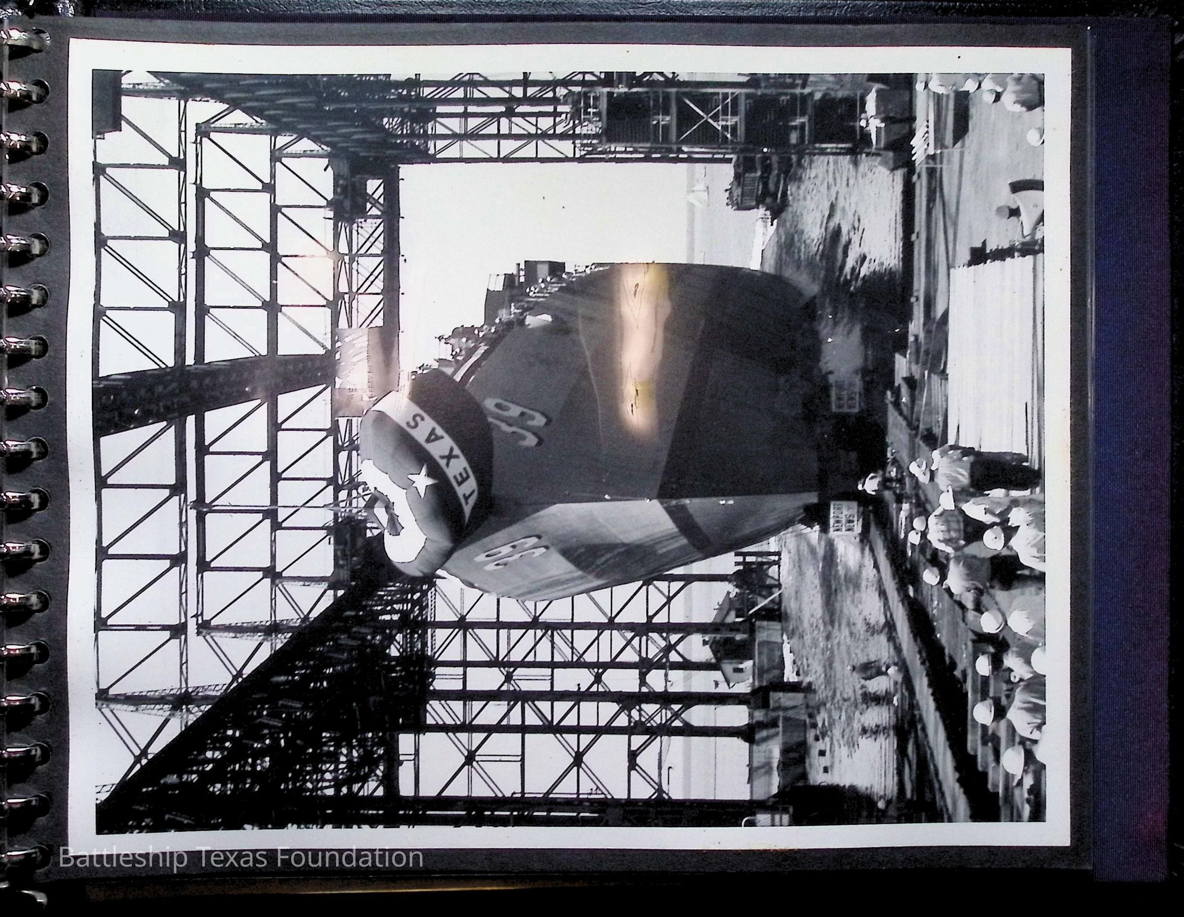 Photo album for the launching of the cruiser USS Texas at Newport News Shipbuilding on August 9, 1975. Contains one picture per page, twelve total, all bound in a dark leather cover. All photos are from the launch of the ship, and the surrounding events.Context