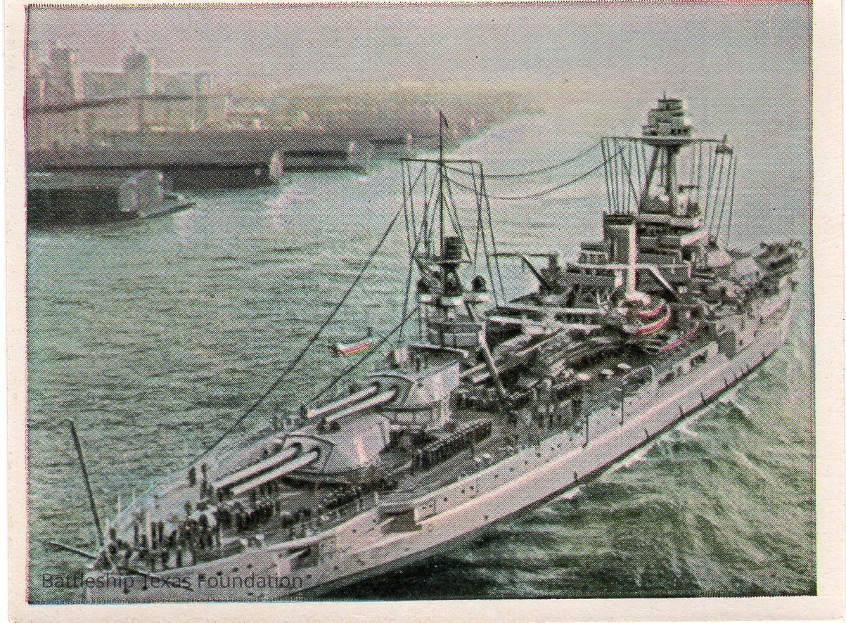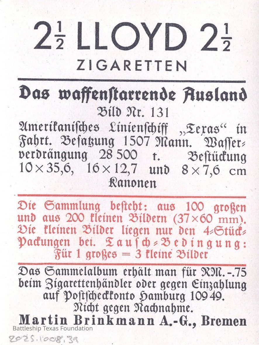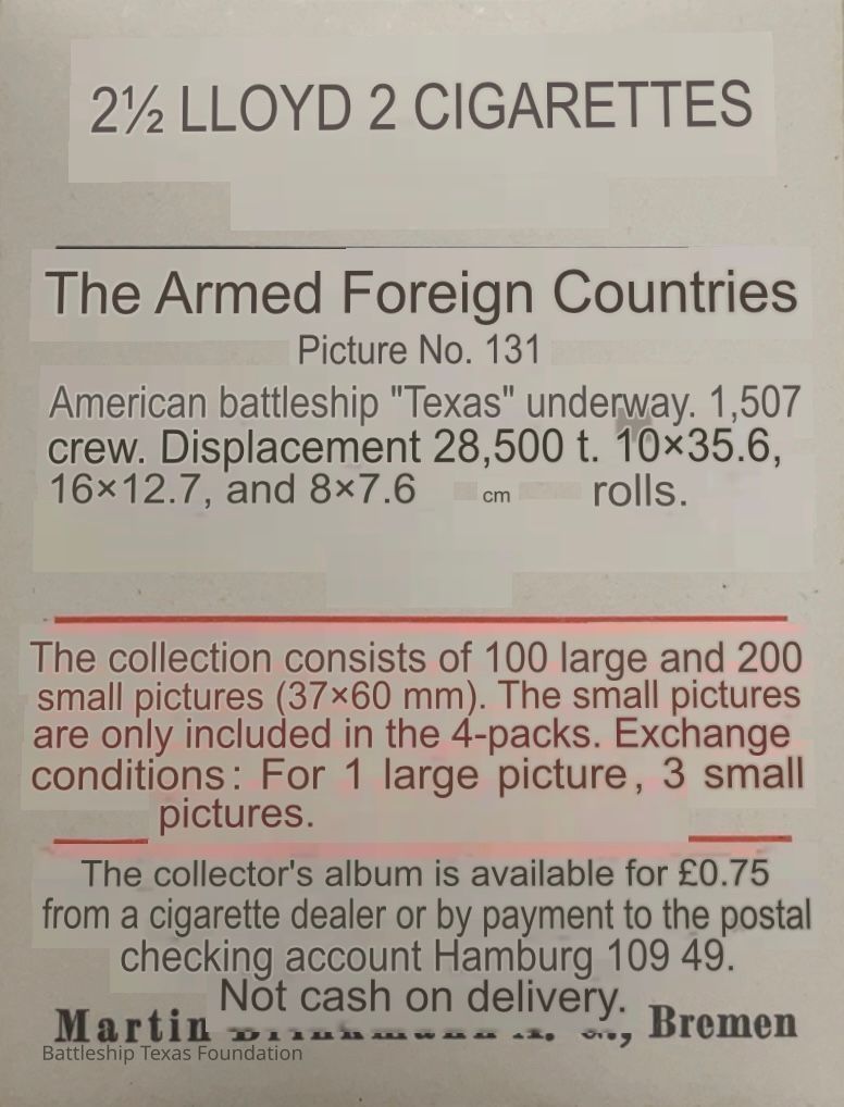 Small card placed within carton of cigarettes sold by German company Lloyd Zigaretten (Cigarettes.) Features a shot of Battleship Texas in the early 1930s.Context