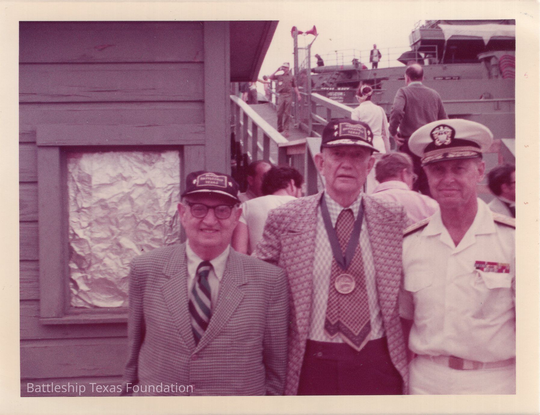 Photo dated April 21, 1973. Features three men including Lloyd Gregory (middle) standing next to the ticket booth in front of Battleship Texas.
