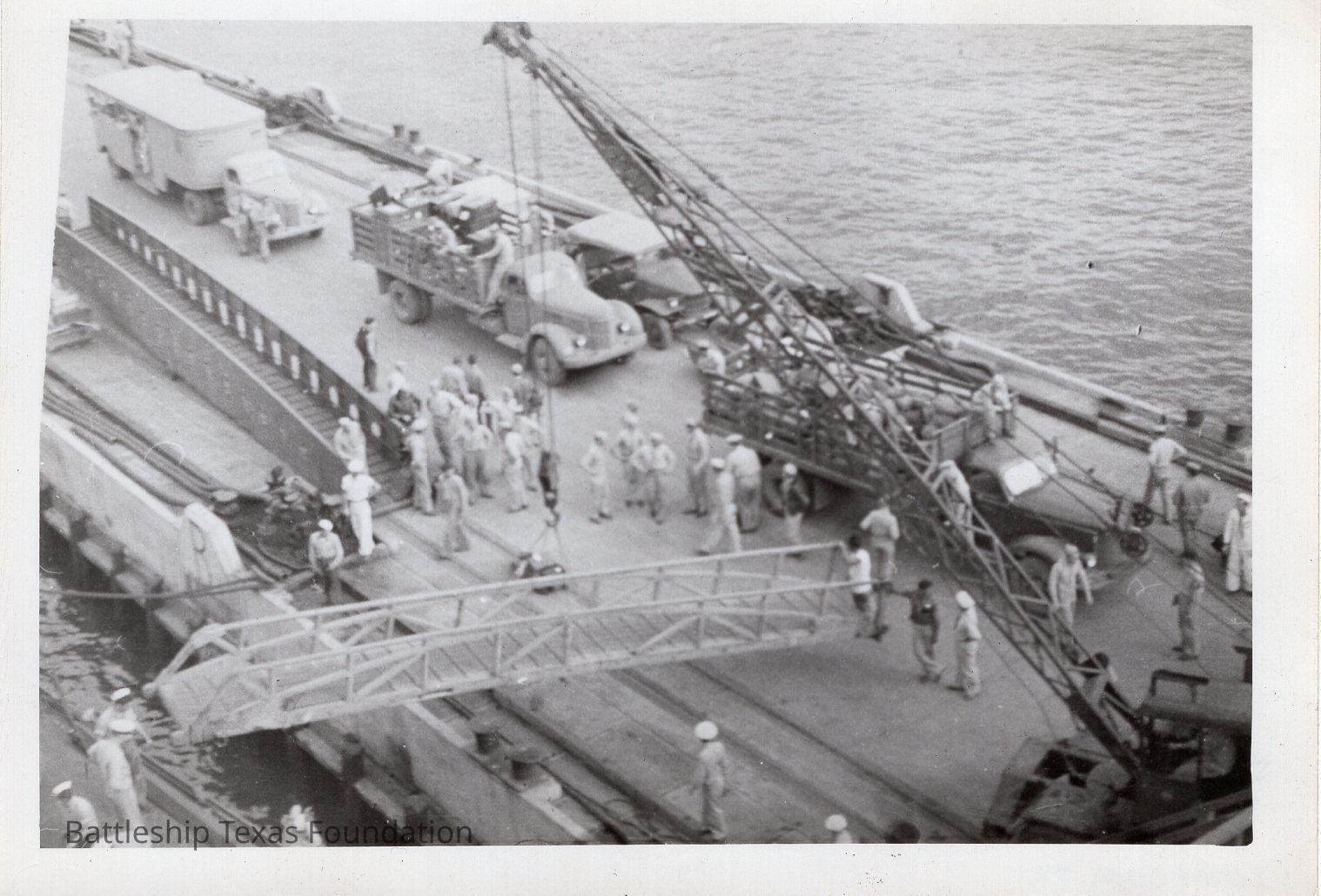 Three trucks, and one car loading materials. Crane lifting gangway. Second gangway on pier.Context