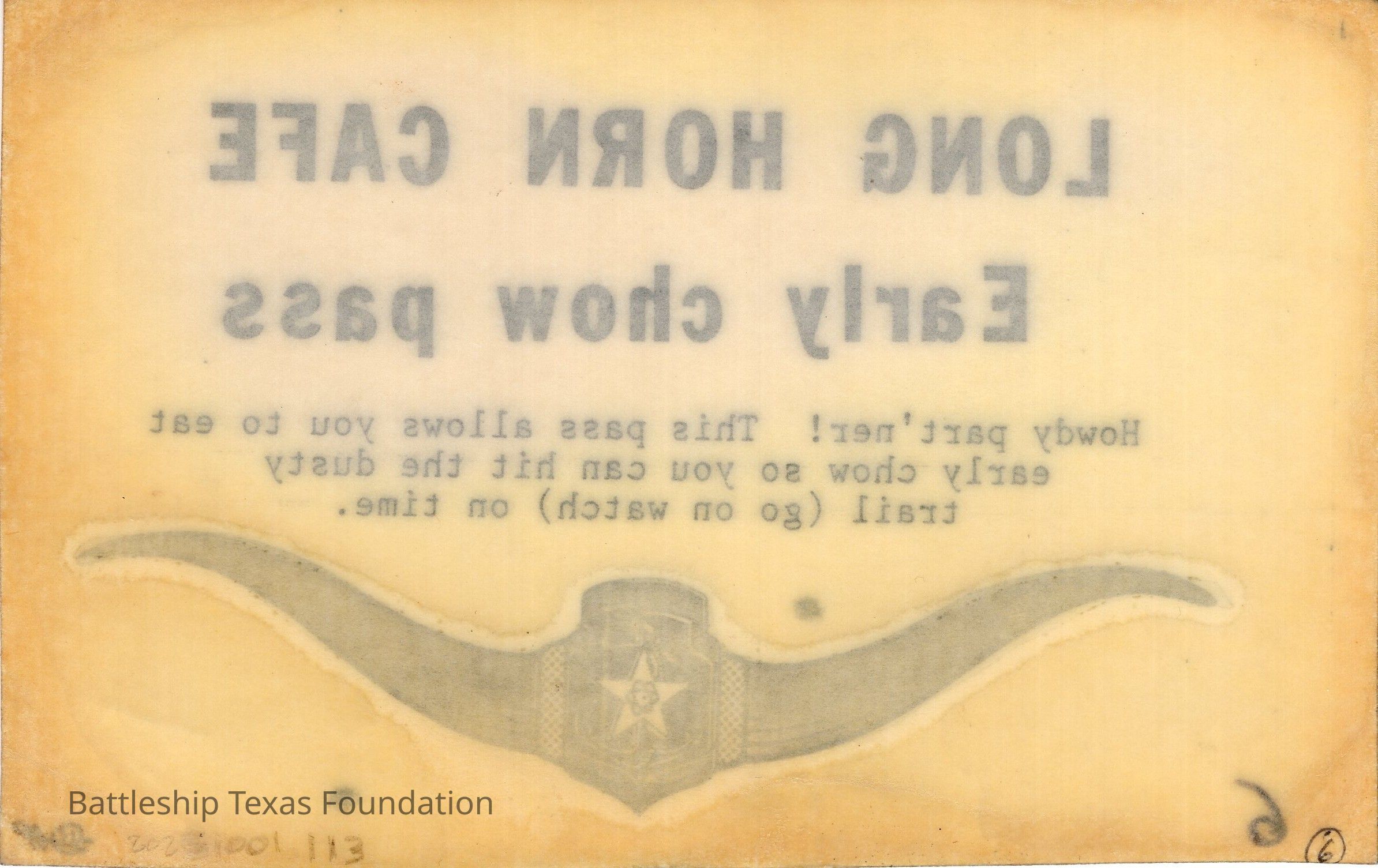 Laminated card for the USS Texas's (CGN-39) cafeteria, called the "Long Horn Cafe" granting holder to eat before the rest of the crew. Lamination is coming apart at the corners.