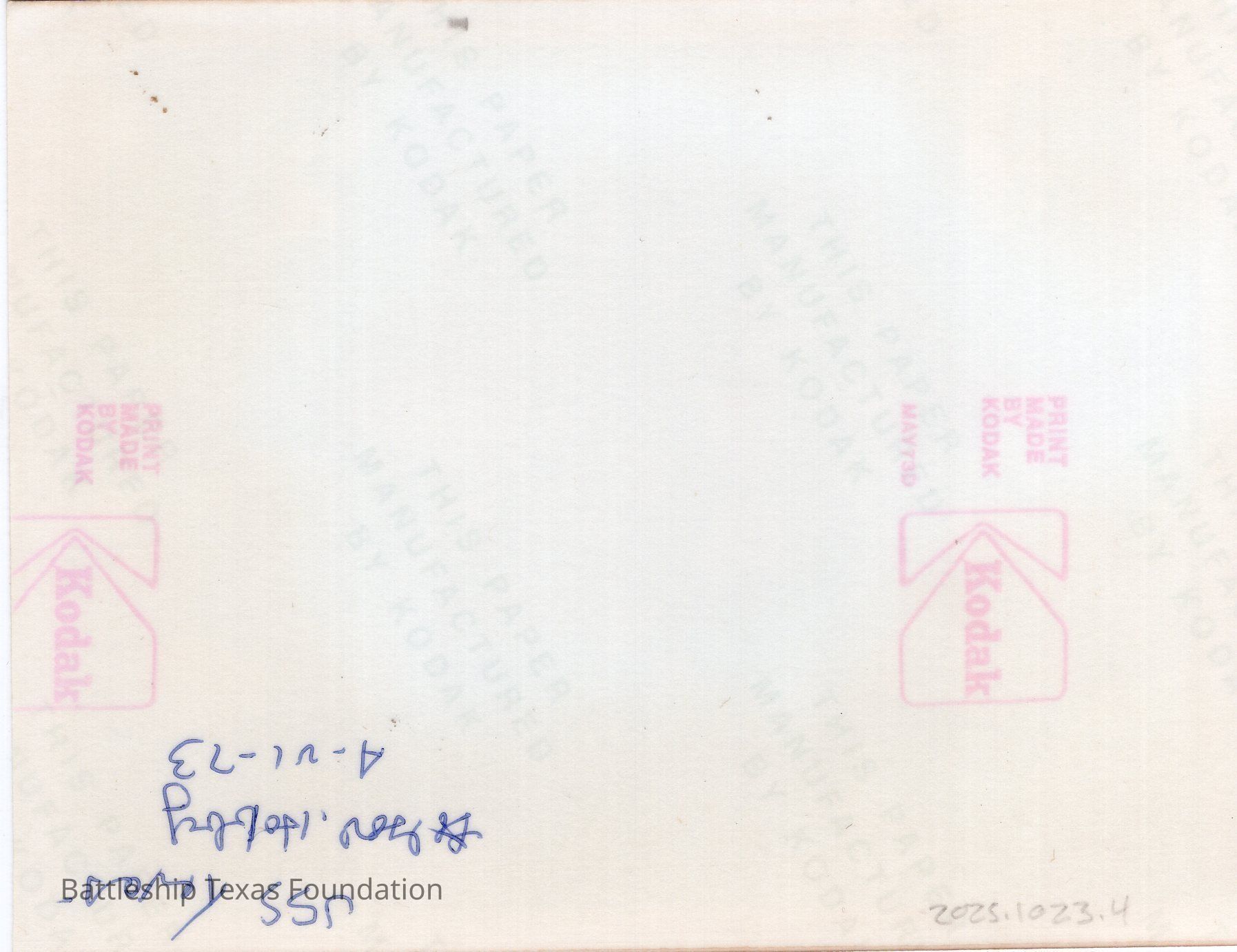 Photo dated April 21, 1973. Image not focused. Taken on starboard side by turret #3. People seated on main deck, and watching from superstructure around aft fire control tower. Speaker is Texas Lieutenant Governor William P. Hobby Jr.Context