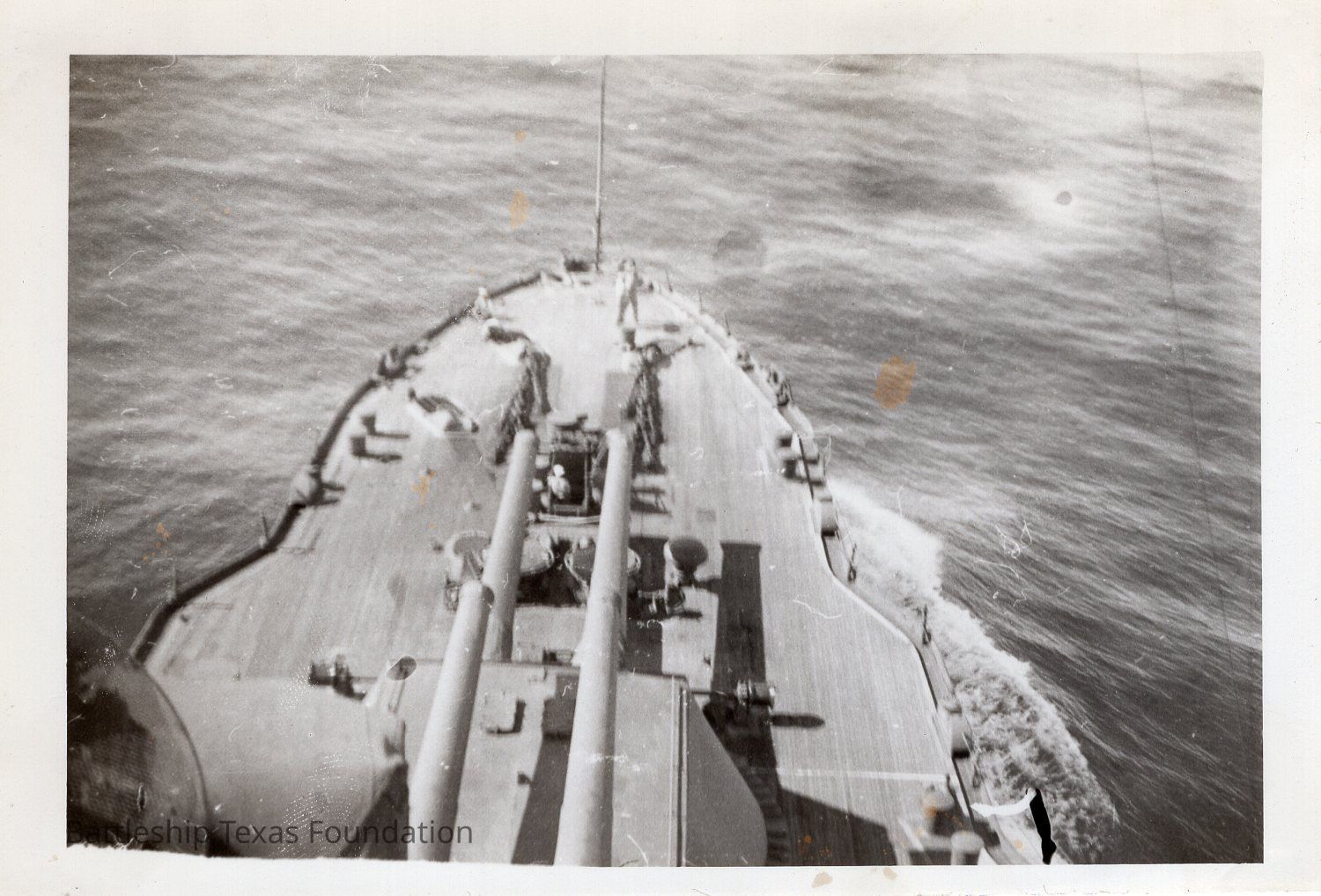 Man stands forward of starboard hawsepipe. Small dark spots on photo.Context
