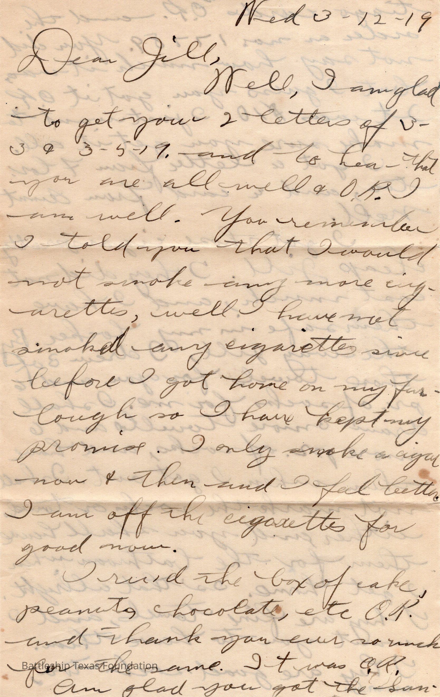 Letter dated March 12, 1919 and addressed to JillContext