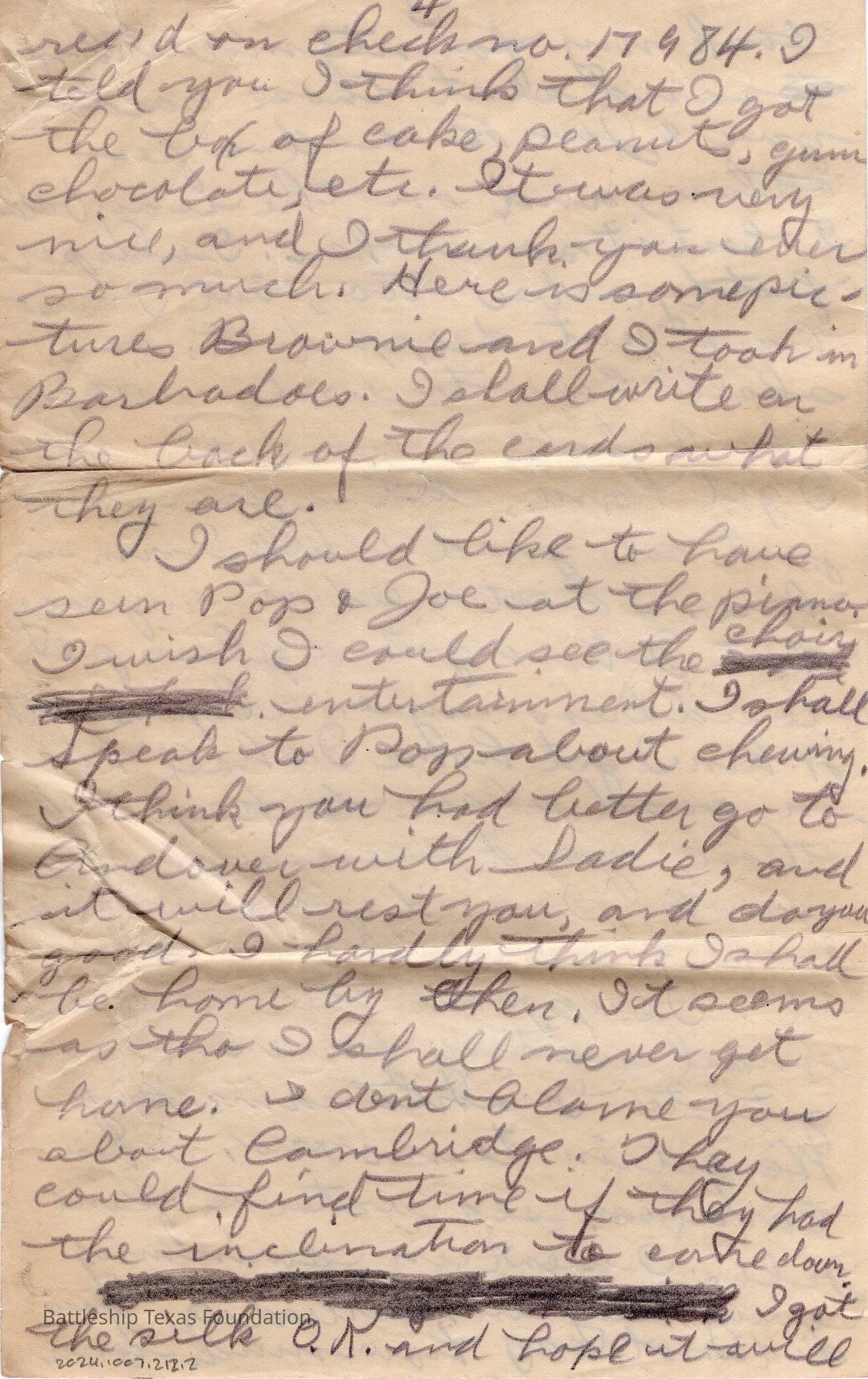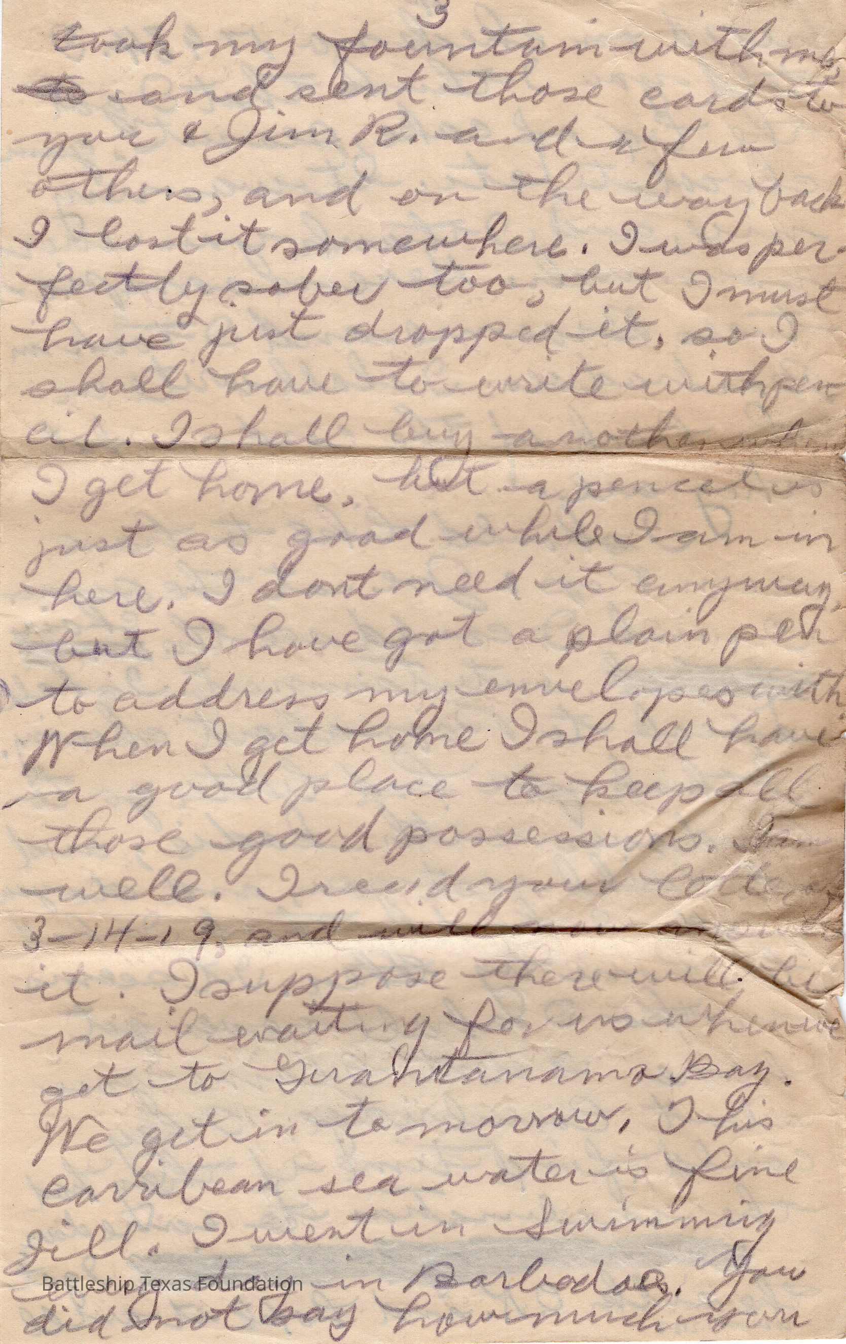 John Lamson was a MM1c on Battleship Texas from May 1917 to June 1919. Throughout his time on Texas, he sent a letter to his family at least once a week, often more. Longer stretches of absence are explained either by movement across the Atlantic, or with the Grand Fleet.