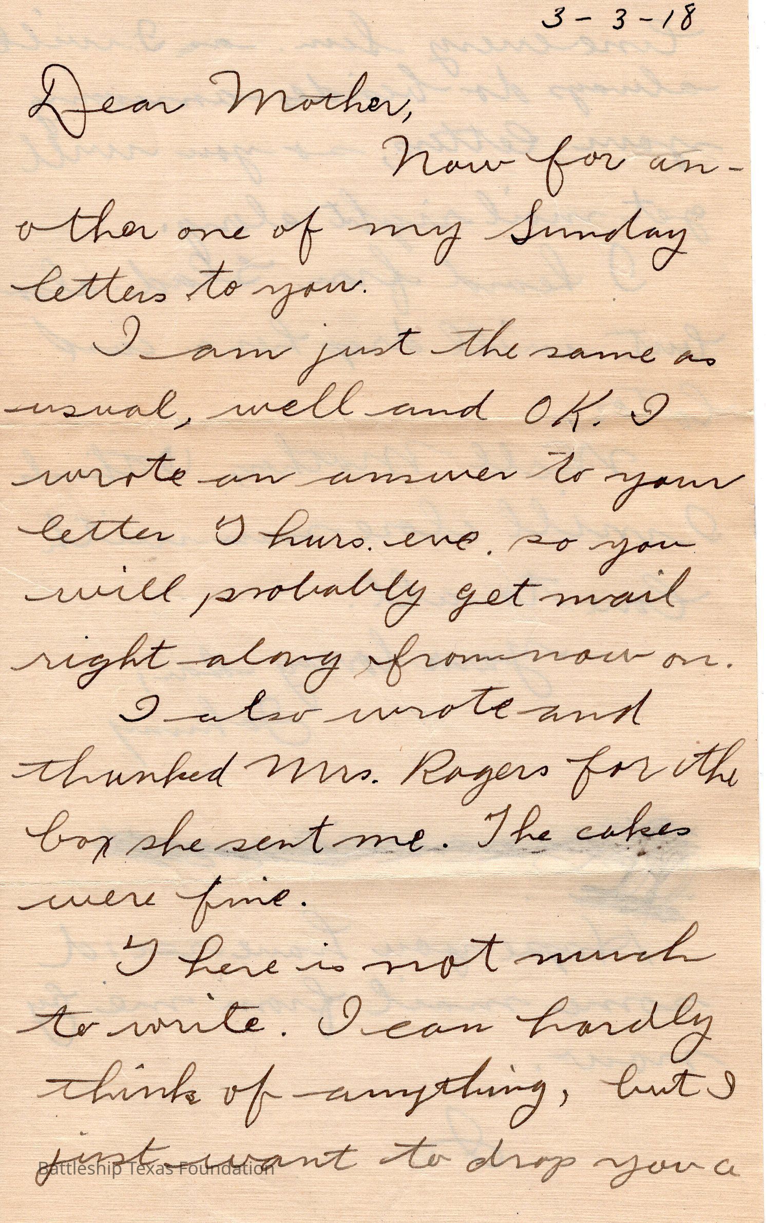 Letter dated 3-3-18 and addressed to Mother. Inked out line on back.Context