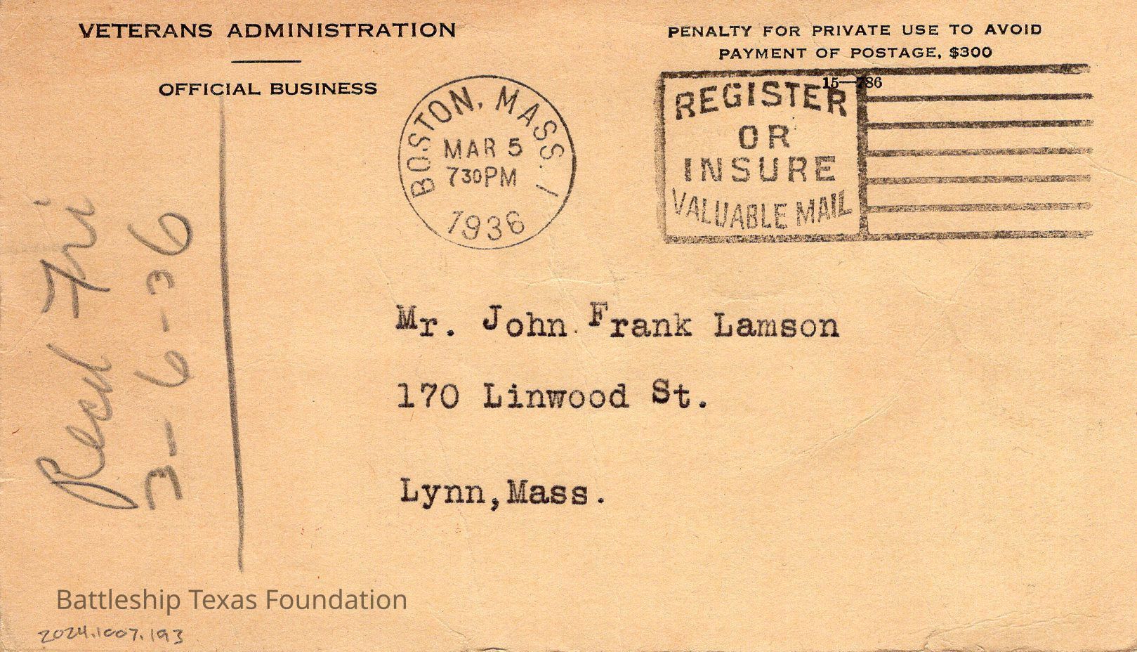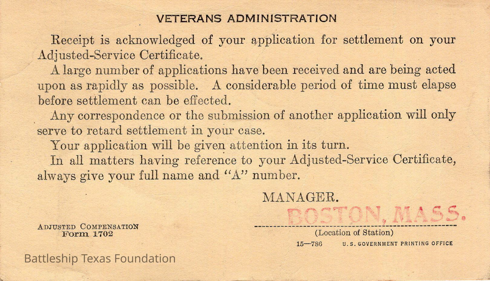 Veterans Administration postcard acknowledging the settlement of adjusted service certificate. Sent March 5, 1936. Marked as read by Lamson on March 6, 1936.Context