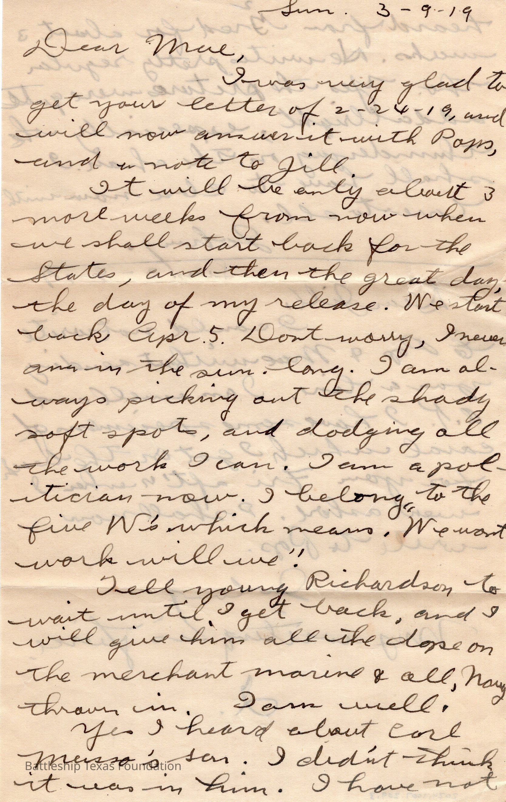 Letter dated March 9, 1919 and addressed to Mae.