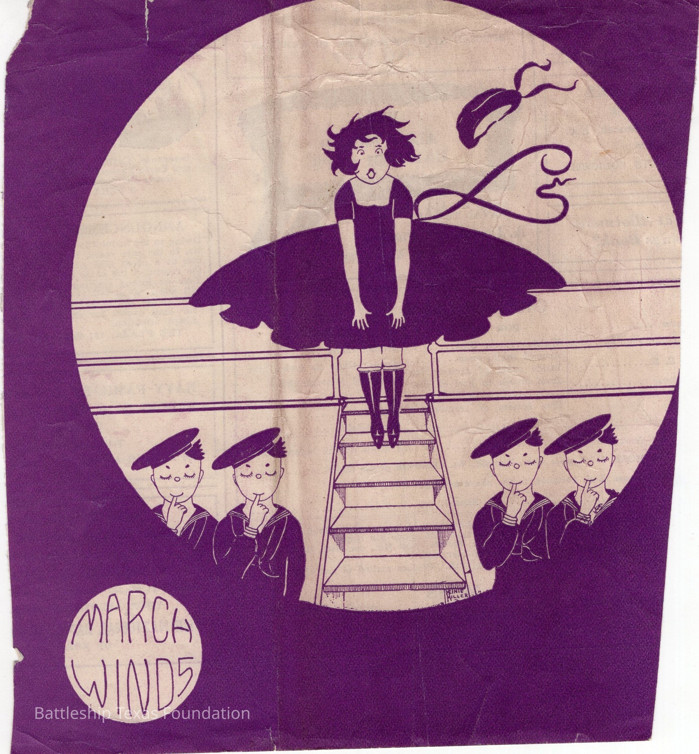 Clipping of a cartoon woman with wind blowing up her skirt. Four sailors smile.Context