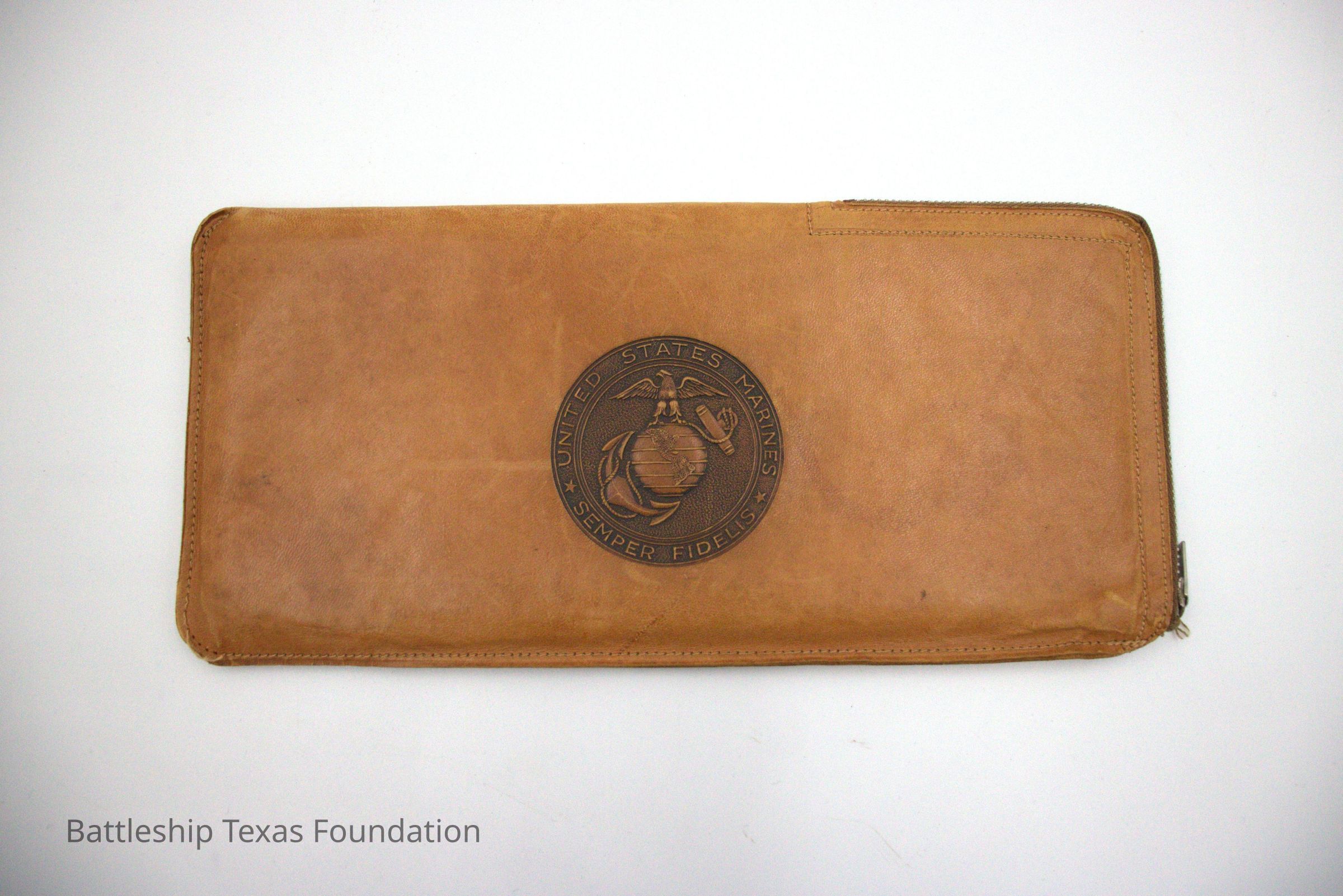 Light brown leather pouch with the USMC EGA on the front. Used for holding documents.Context