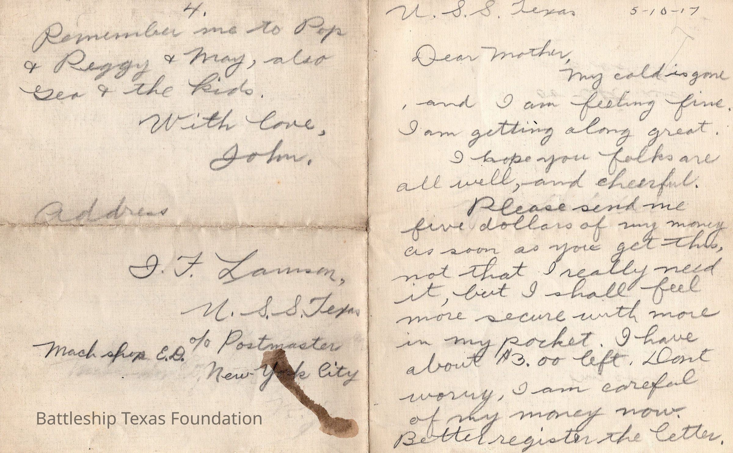 John Lamson was a MM1c on Battleship Texas from May 1917 to June 1919. Throughout his time on Texas, he sent a letter to his family at least once a week, often more. Longer stretches of absence are explained either by movement across the Atlantic, or with the Grand Fleet.