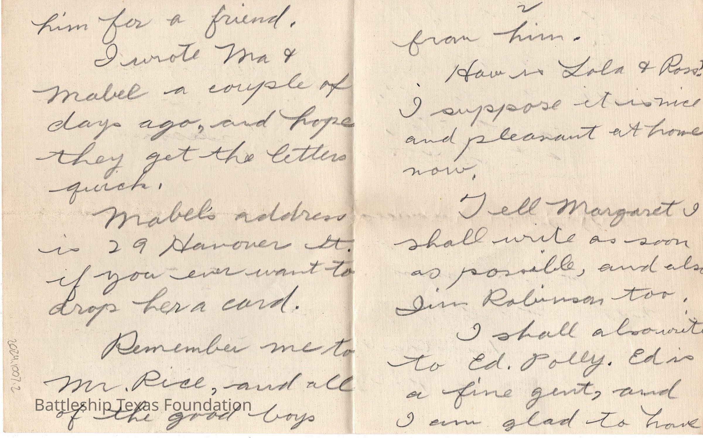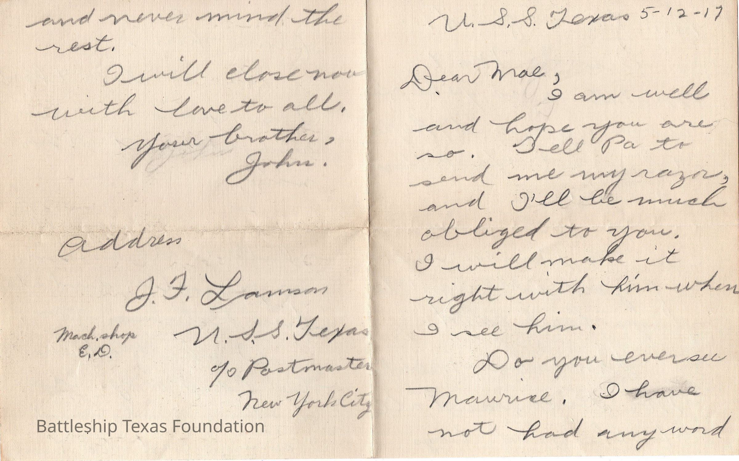 John Lamson was a MM1c on Battleship Texas from May 1917 to June 1919. Throughout his time on Texas, he sent a letter to his family at least once a week, often more. Longer stretches of absence are explained either by movement across the Atlantic, or with the Grand Fleet.