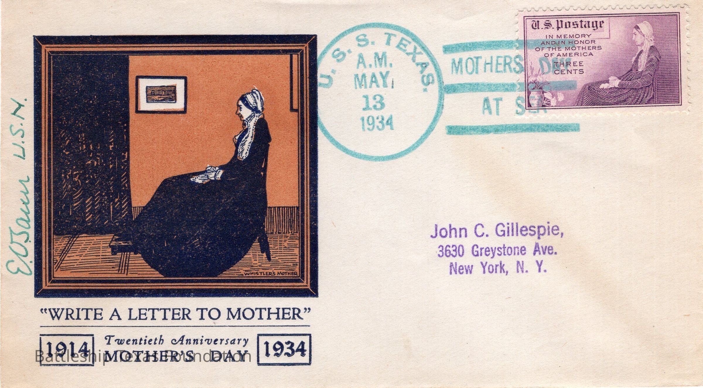 Addressed to John C. Gillespie from E.O. Tauer. Envelope sent from USS Texas on the morning of May 13, 1934, while the ship was celebrating Mother's Day. Features a stamp with a graphic representation of Arrangement in Grey and Black No. 1 by James McNeill Whistler, commonly referred to as Whistler's Mother. Underneath the stamp is a line reading "WRITE A LETTER TO MOTHER" while celebrating the 20th anniversary of the holiday.Context
