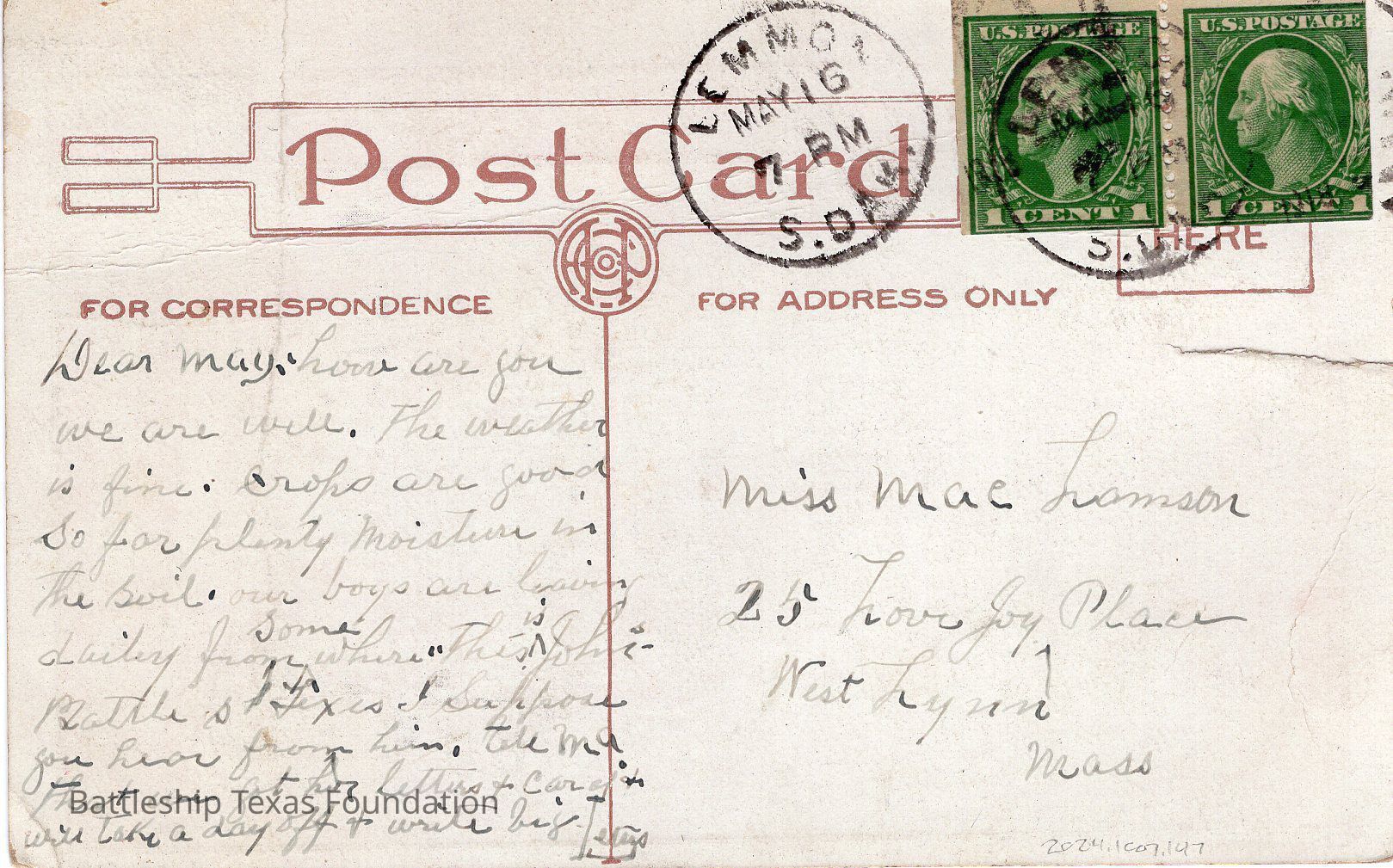 John Lamson was a MM1c on Battleship Texas from May 1917 to June 1919. Throughout his time on Texas, he sent a letter to his family at least once a week, often more. Longer stretches of absence are explained either by movement across the Atlantic, or with the Grand Fleet.Collection