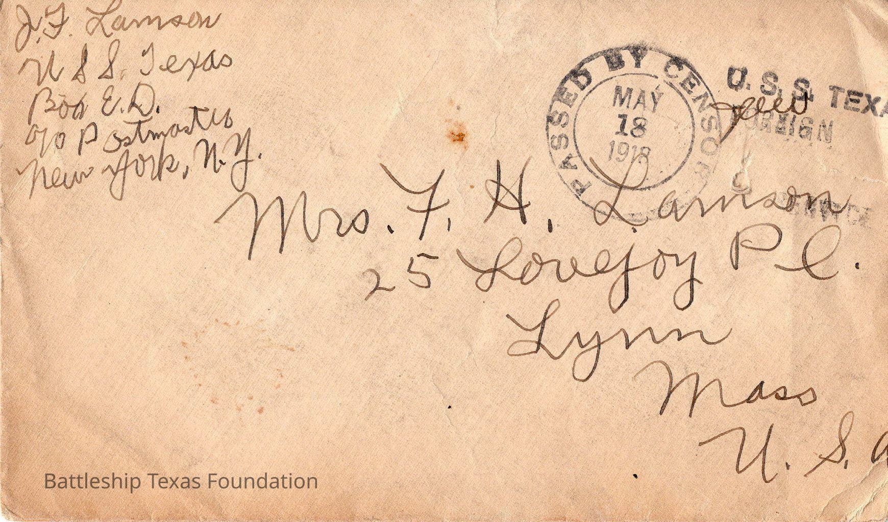 Envelope stamped "PASSED BY CENSOR MAY 18 1918" and "U.S.S. TEXAS FOREIGN SERVICE"Context
