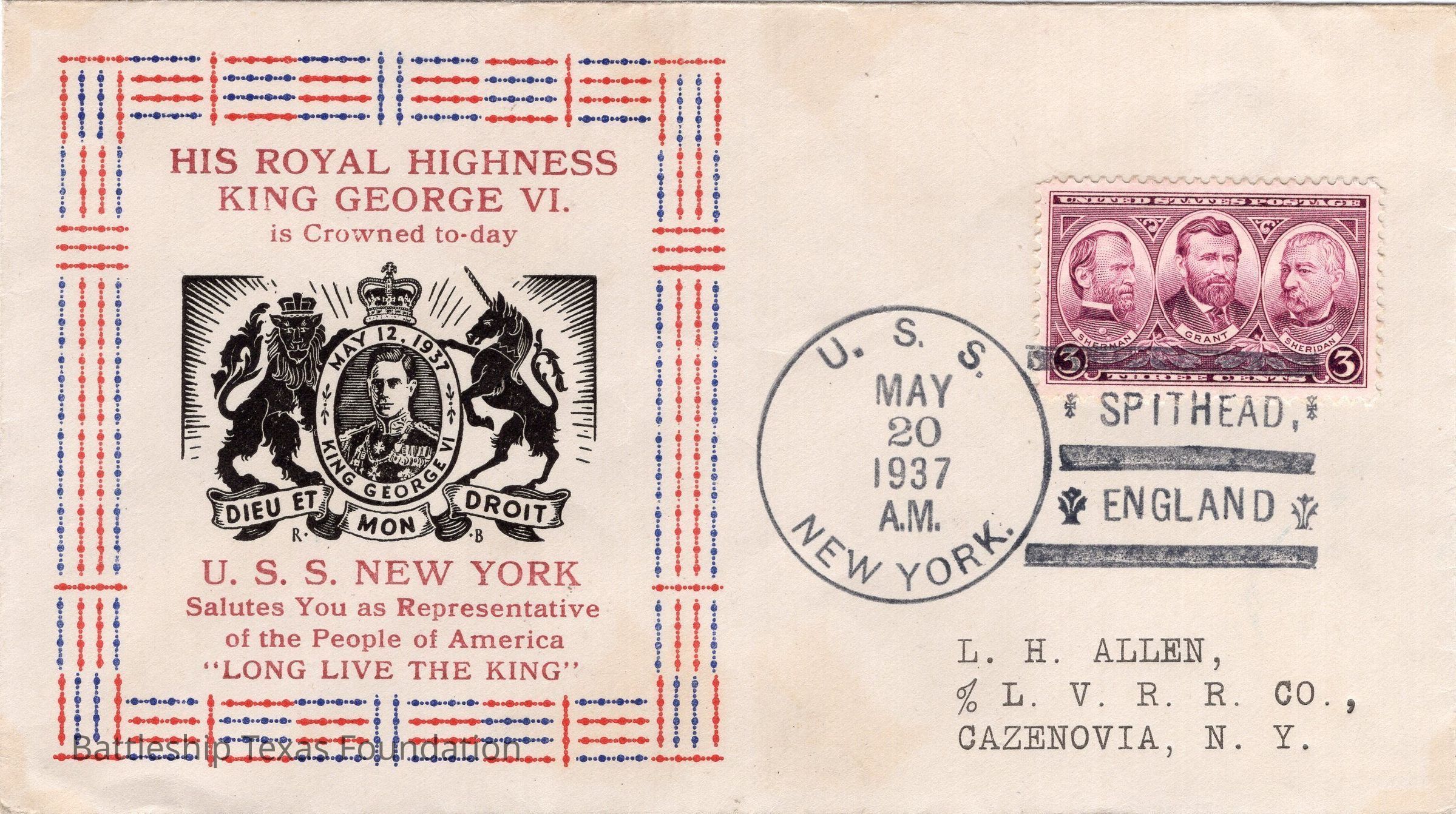 Addressed to L.H. Allen. Envelope sent from USS Texas on the morning of May 20, 1937, when the ship was in Spithead, England. Features a square stamp with "USS New York Leaves for England" on the top, Britain's Royal Coat of Arms in the middle, and "Coronation to his Majesty King George VI" on the bottom.