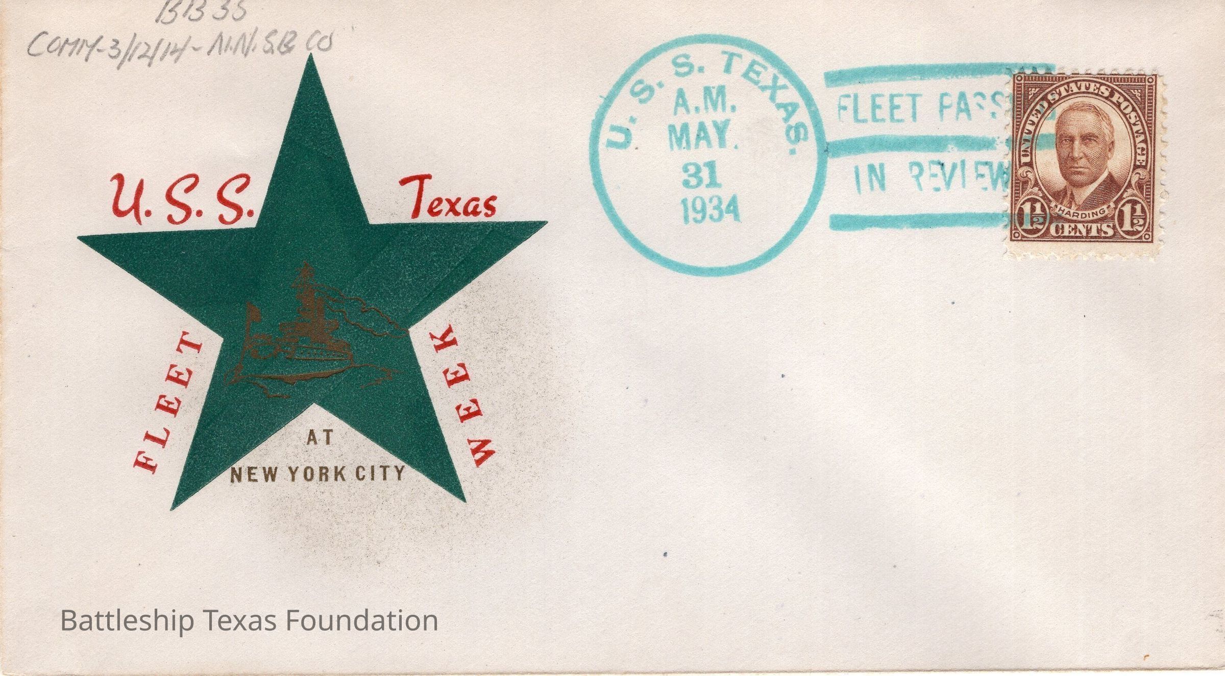 Envelope sent from USS Texas on the morning of May 31, 1934, while the ship was in New York City during Fleet Week. Features a stamp of a star wrapped in text.