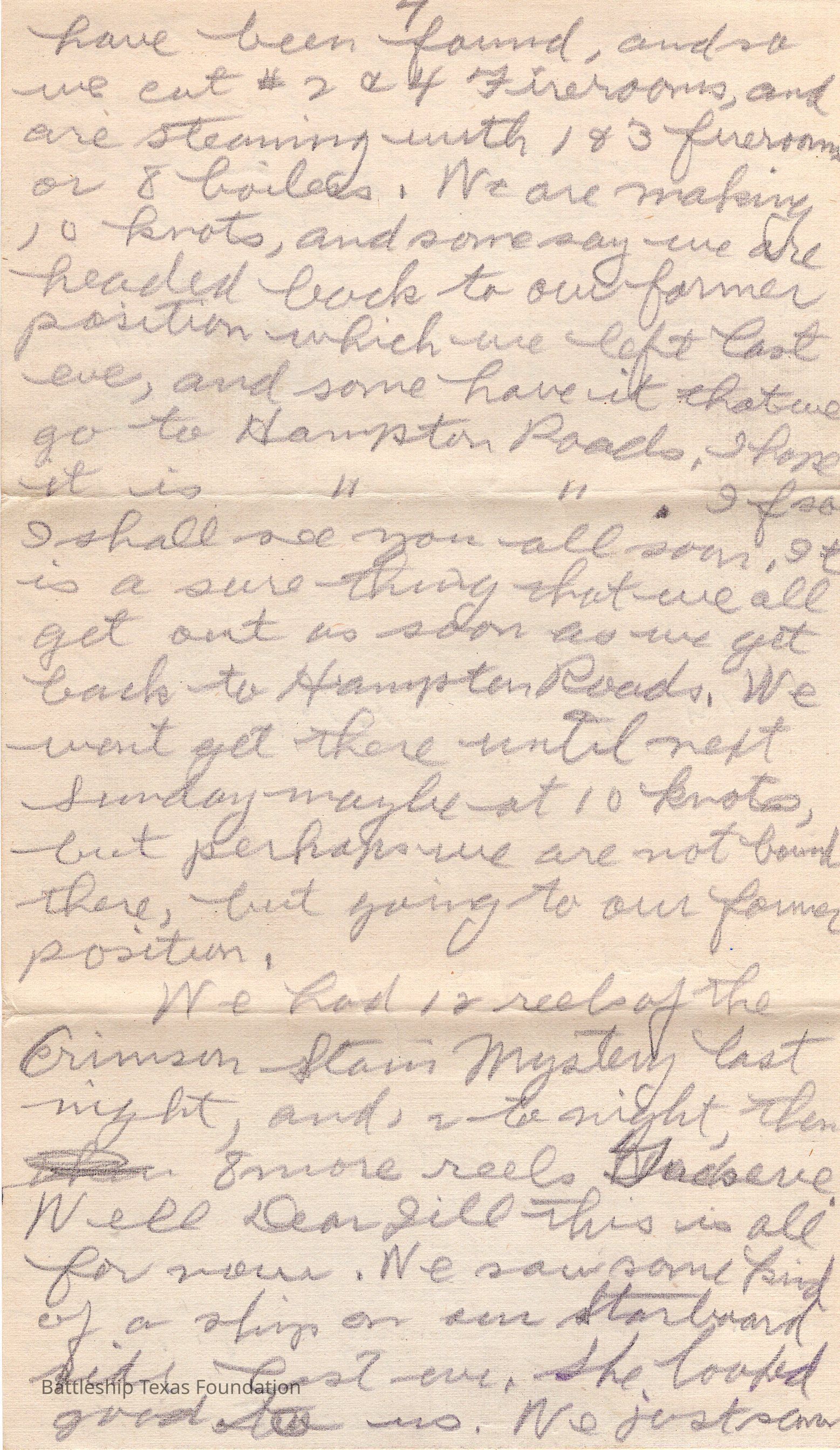 John Lamson was a MM1c on Battleship Texas from May 1917 to June 1919. Throughout his time on Texas, he sent a letter to his family at least once a week, often more. Longer stretches of absence are explained either by movement across the Atlantic, or with the Grand Fleet.