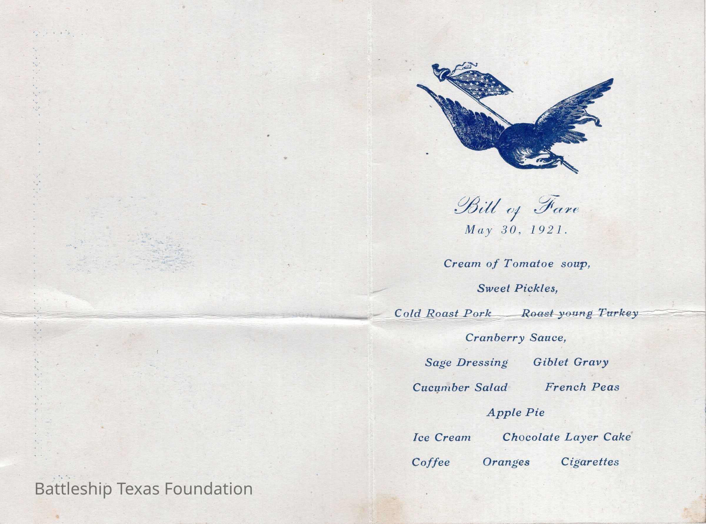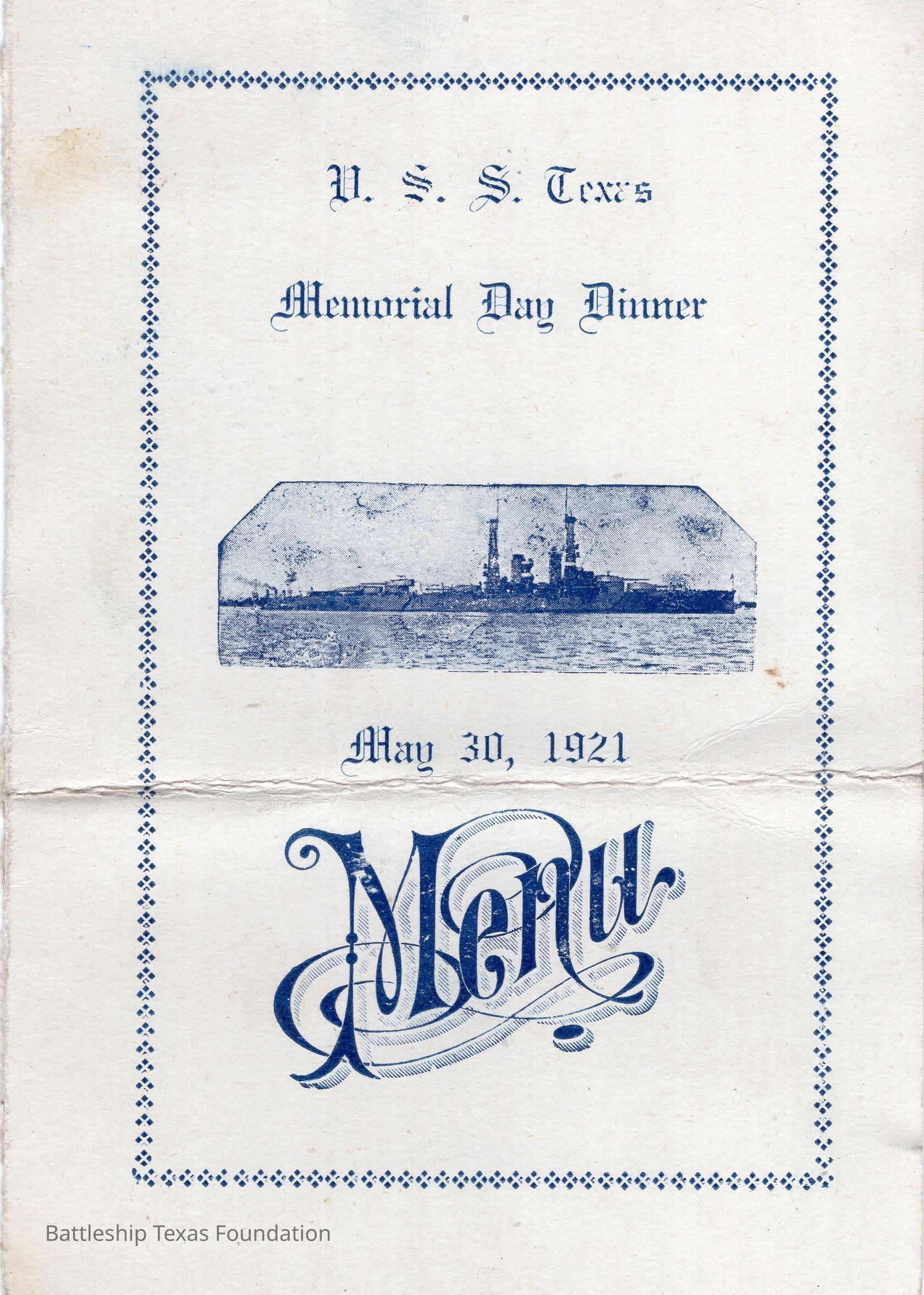 Menu for the USS Texas's Memorial Day dinner on May 30, 1921. Image of Texas on cover.Context