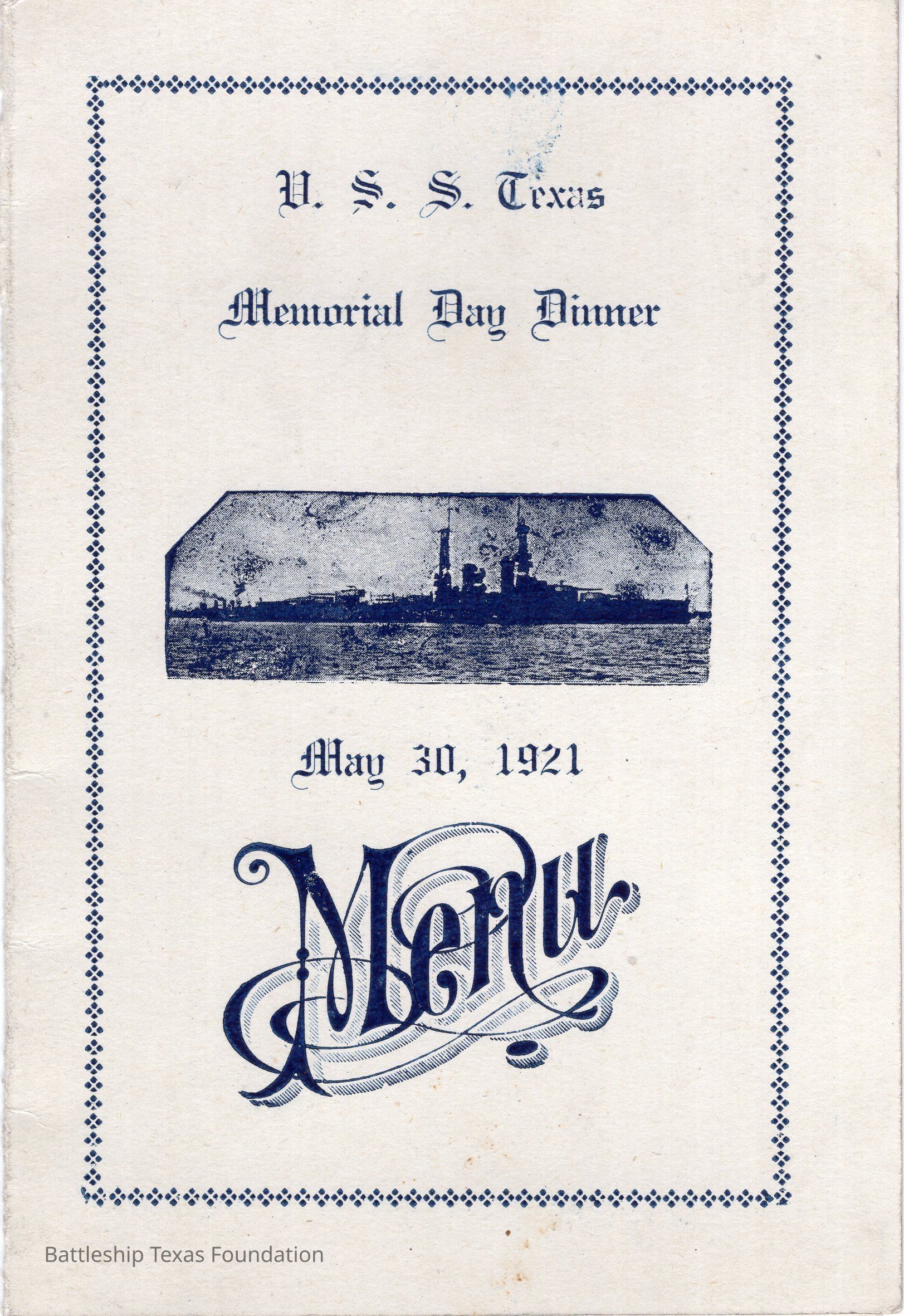 Menu for the Memorial Day DInner on May 30, 1921.Context