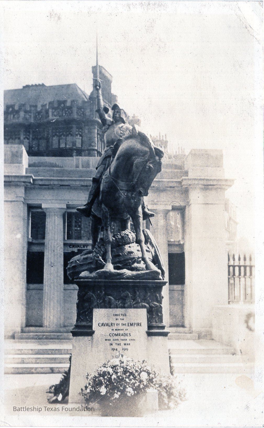 Features an armored rider atop a horse thrusting his sword upward. Statue erected by the Cavalry of the Empire to honor those lost between 1914 and 1919.Context
