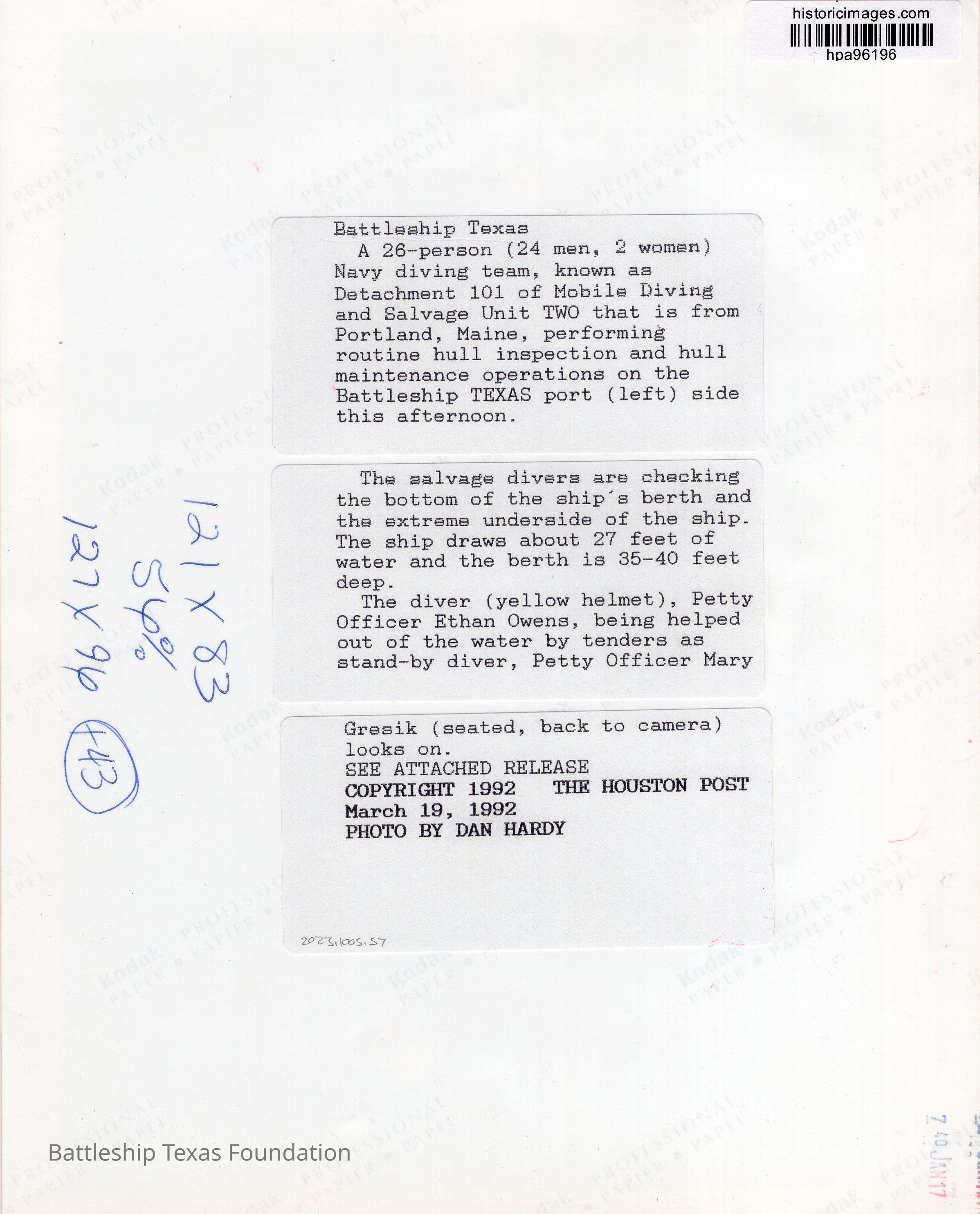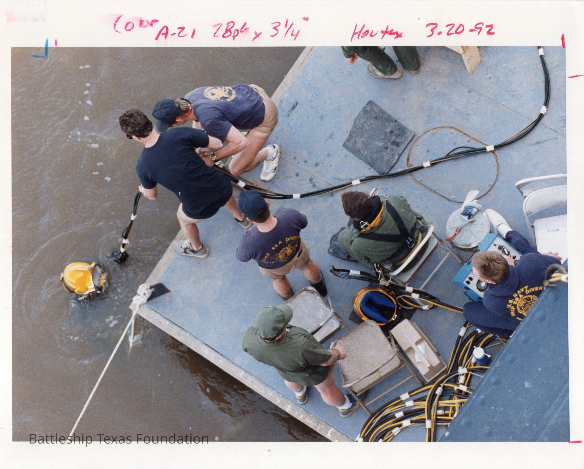 Seven men on platform feeding lines to Diver in water.Context