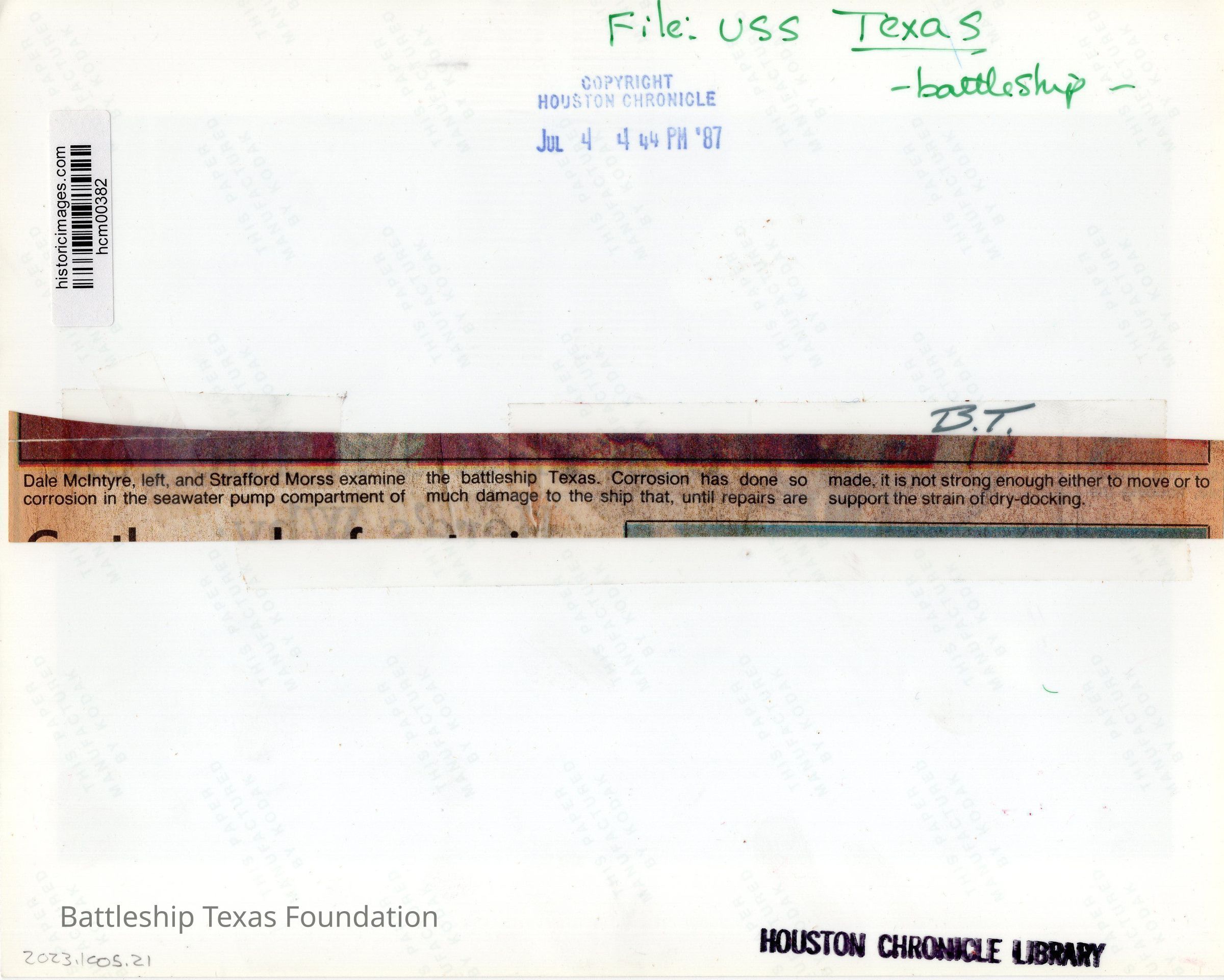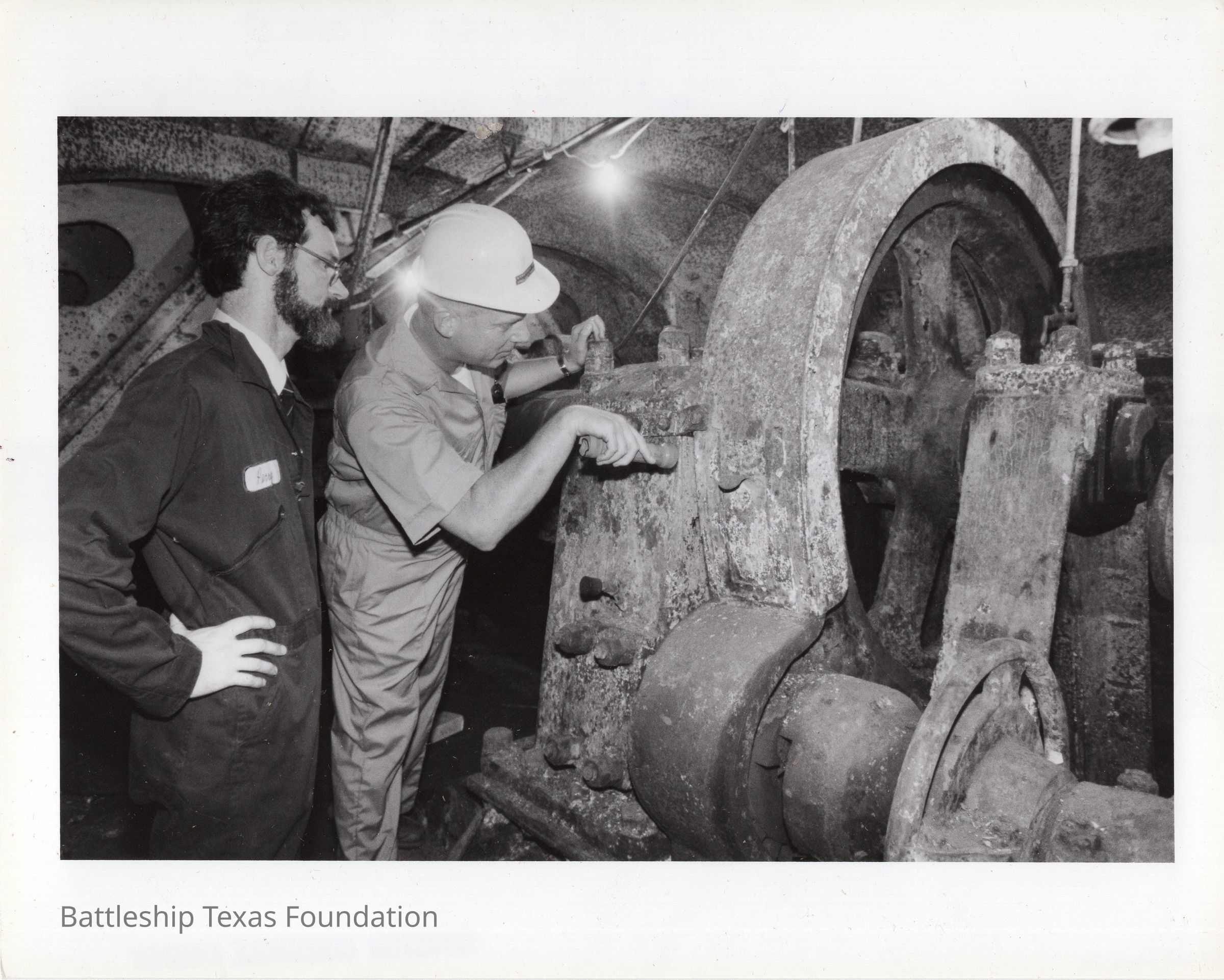 Dale McIntyre (left) and Strafford Morse (right w/ hardhat) work in the corroded compartment. Big steering gear to the right. Back stamp dates the photo to July 4, 1987.Context