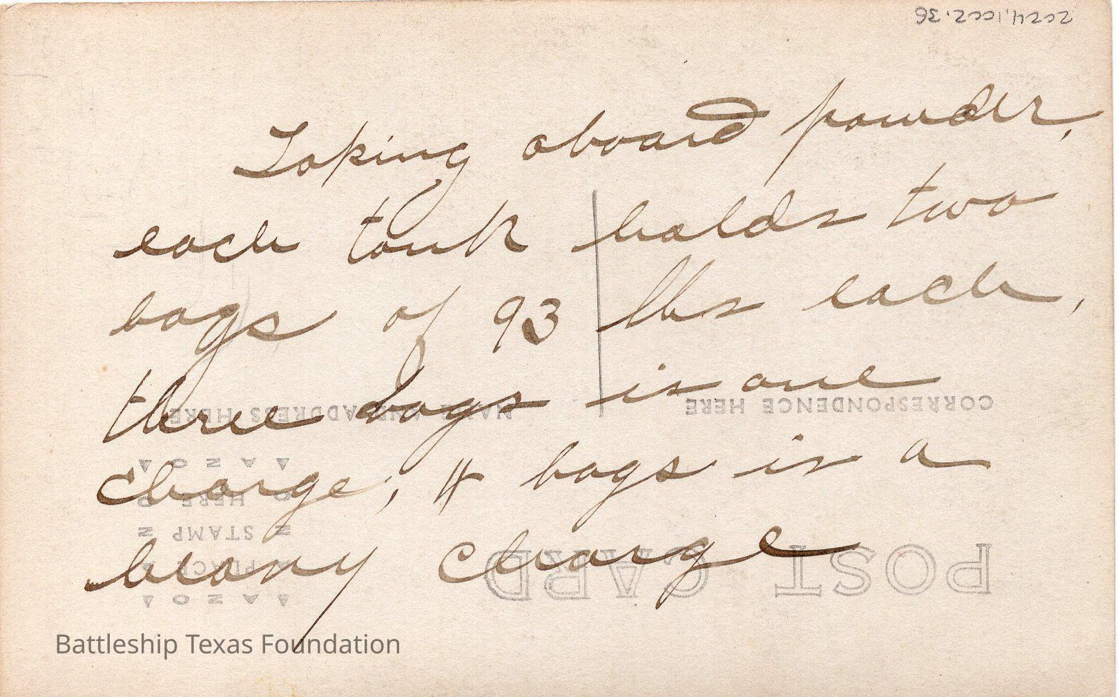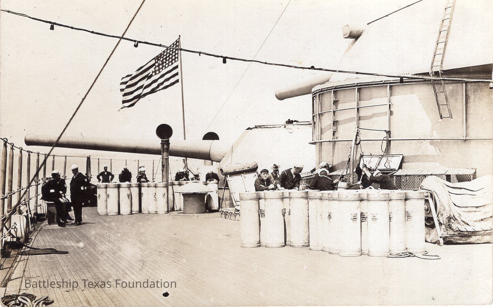 Men rest with powder canisters sat upright near turrets 4 and 5. Turret 5 turned to starboard. Barrier on edge of deck.