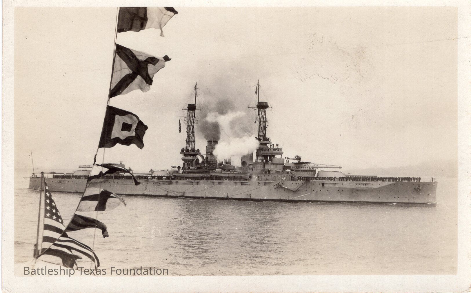 Men on deck of Texas. FLags of another ship cover left side of photo.Context