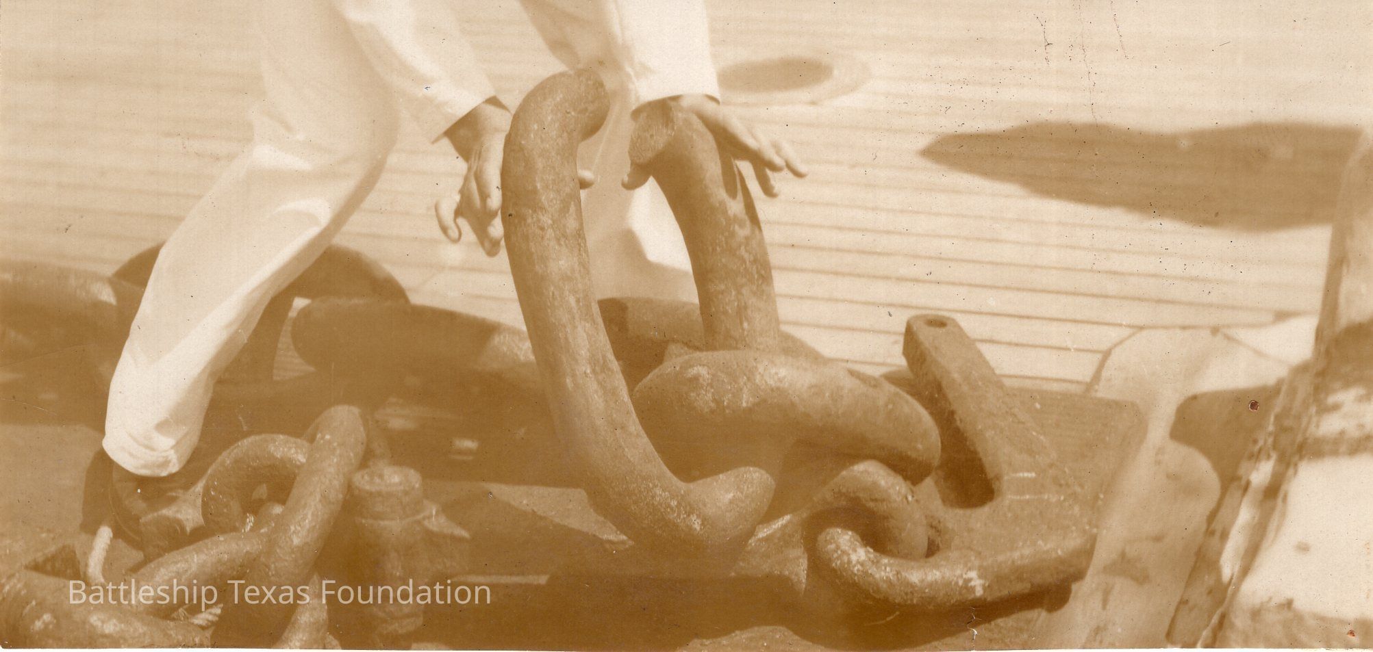 Features a sailor grasping an opened chain link on the main deck.Context
