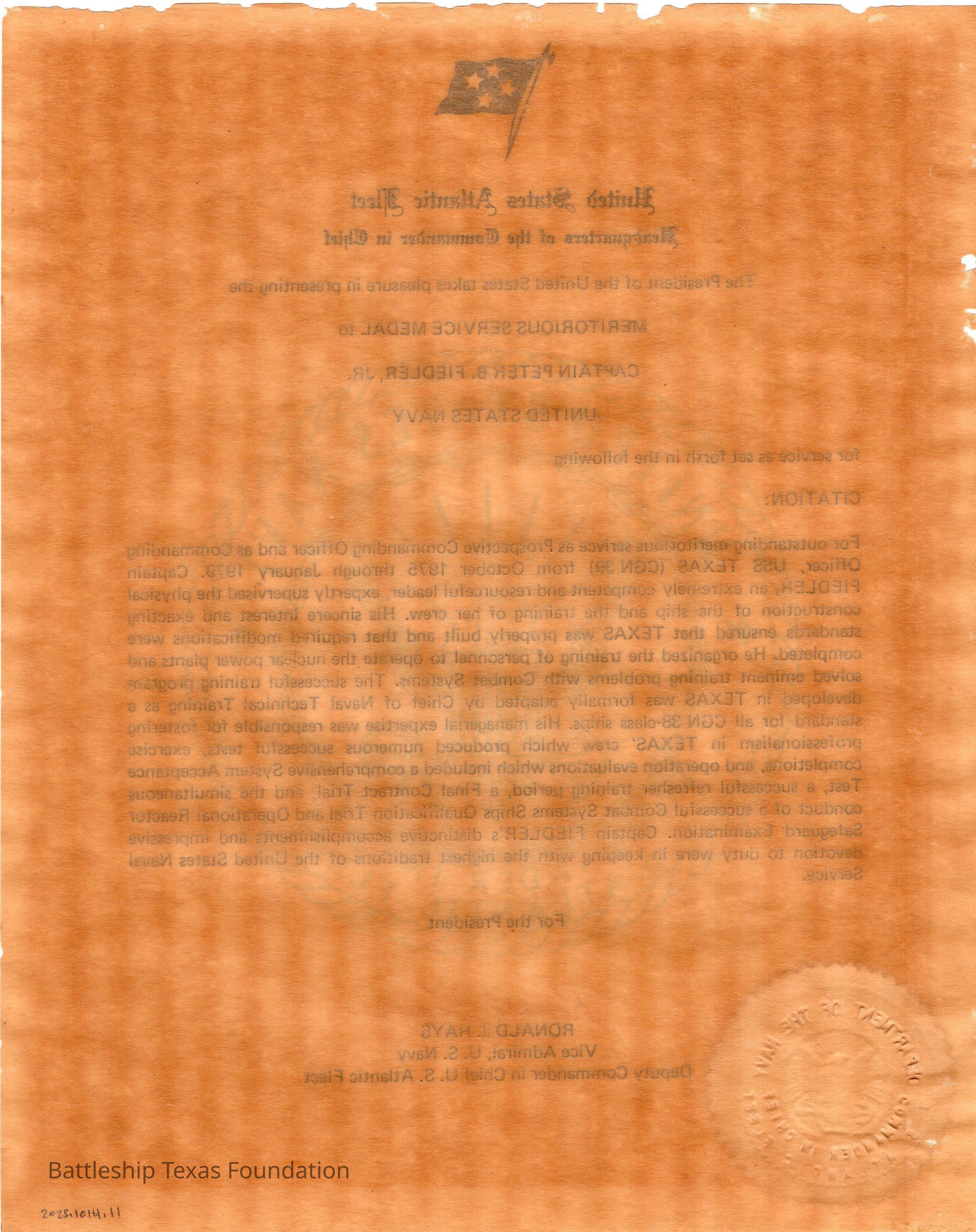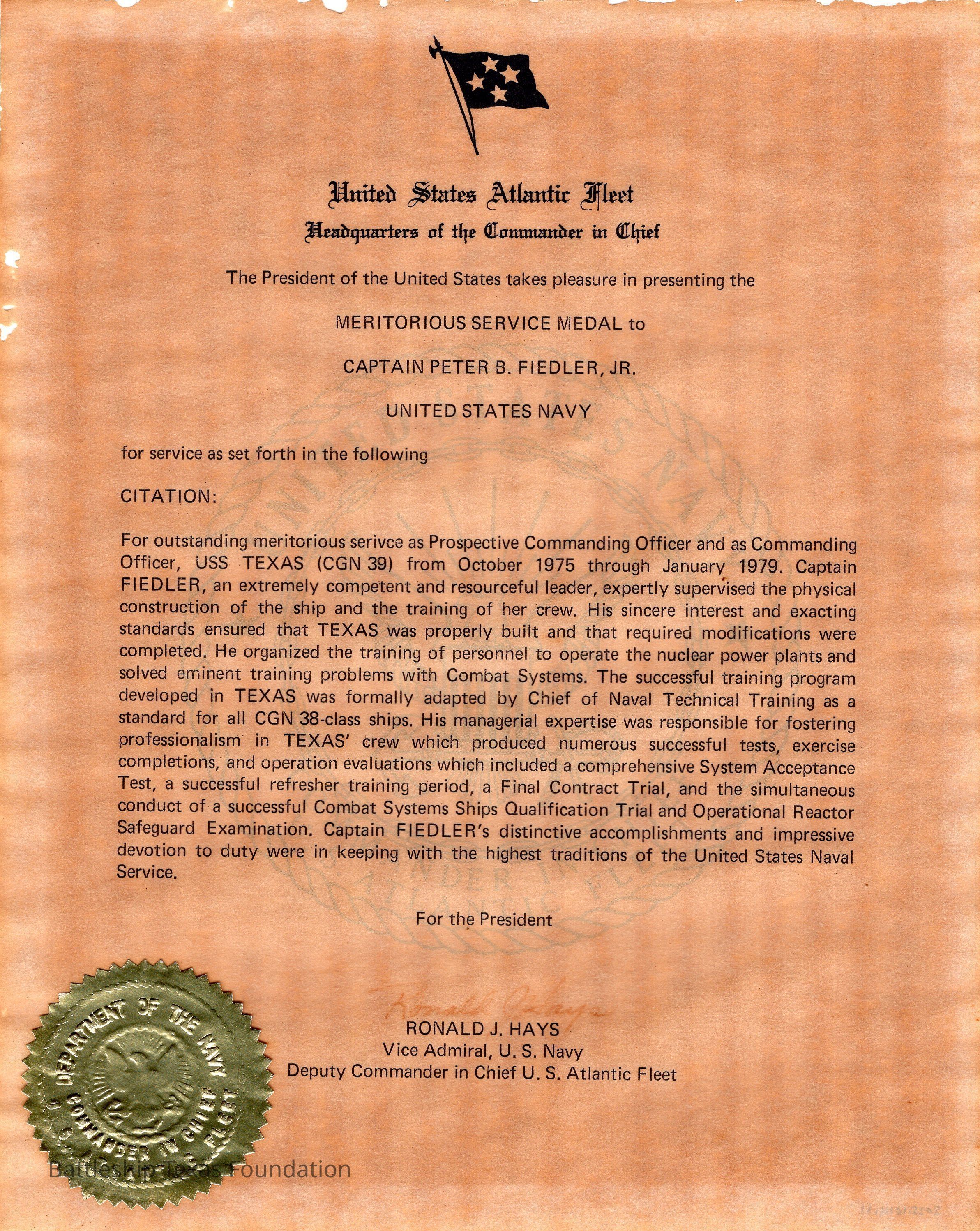 Notice from the United States Atlantic Fleet Headqwuarters of the Commander in Chief that the POTUS awarded Captain Fiedler the Meritorious Service Medal for commanding Cruiser Texas.Context