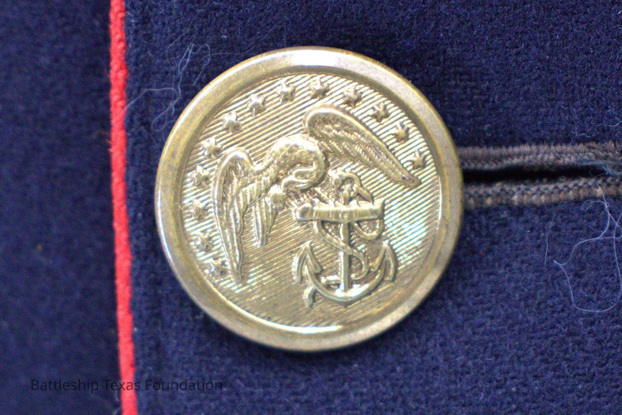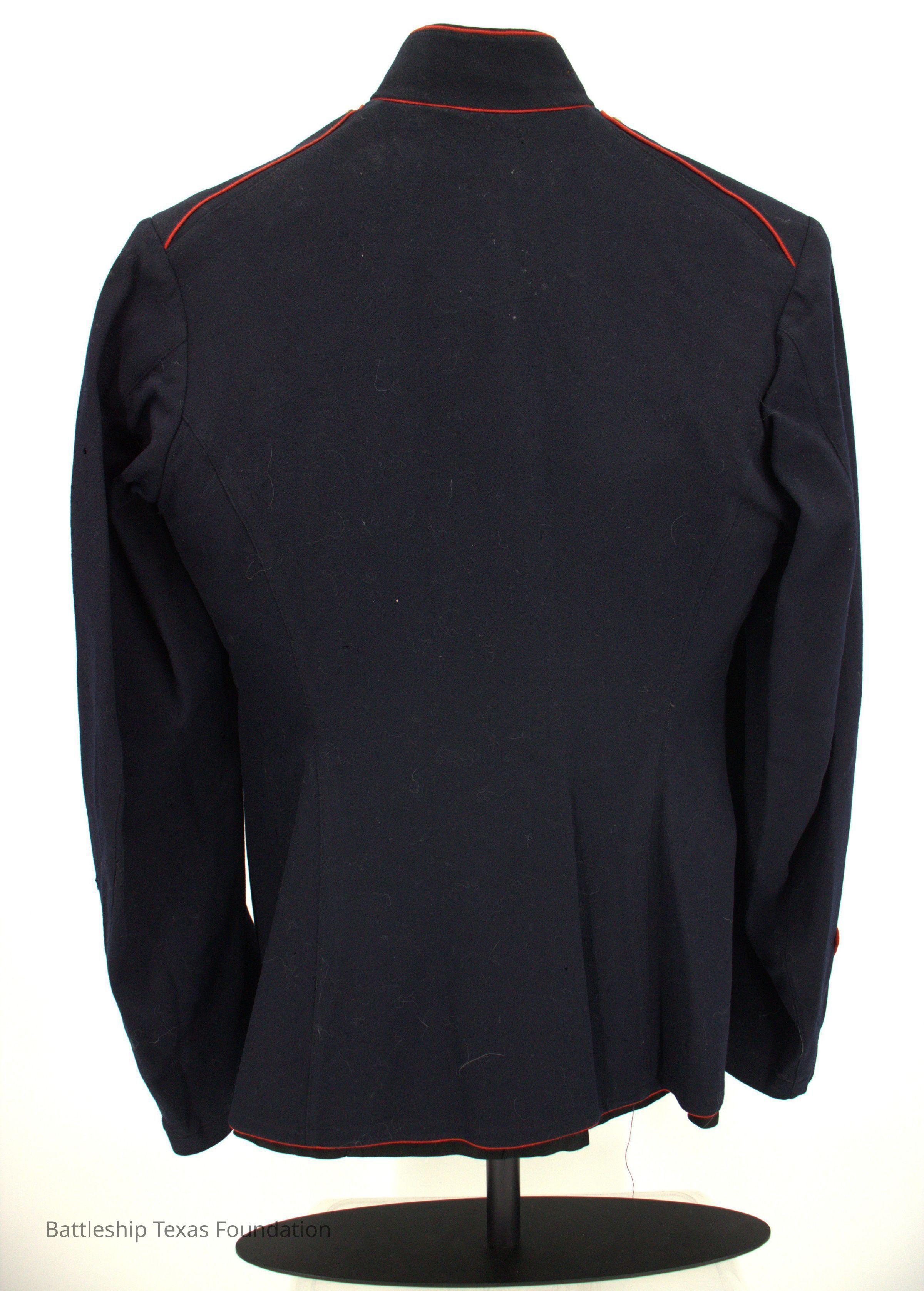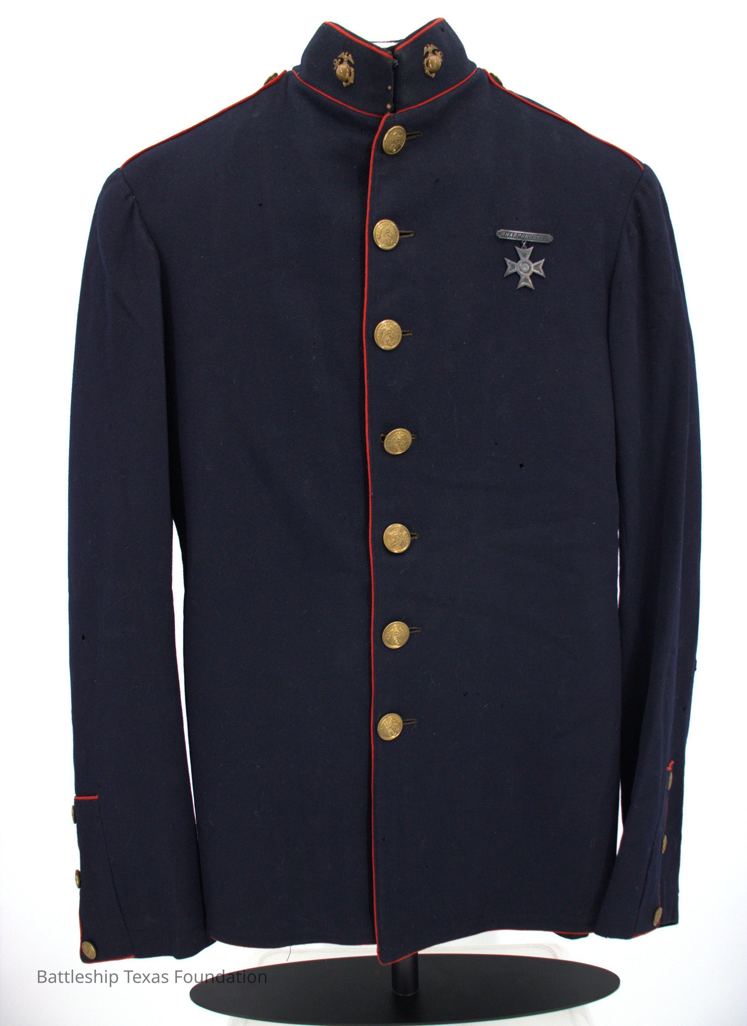 US Marine Corps uniform owned by Millard Murdock and donated to BTF by Benjamin Johnson while he was a crewmember on Texas in the 1920s. Uniform includes a sharpshooter medal on the left breast. Small holes on front, collar, and back.Context