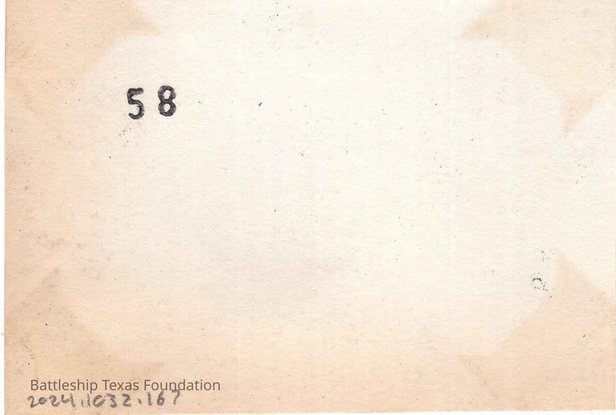 From a donated collection of individual photographs and pages out of a Texas crewmember's photo album. Items donated by the Los Angeles Maritime Museum.