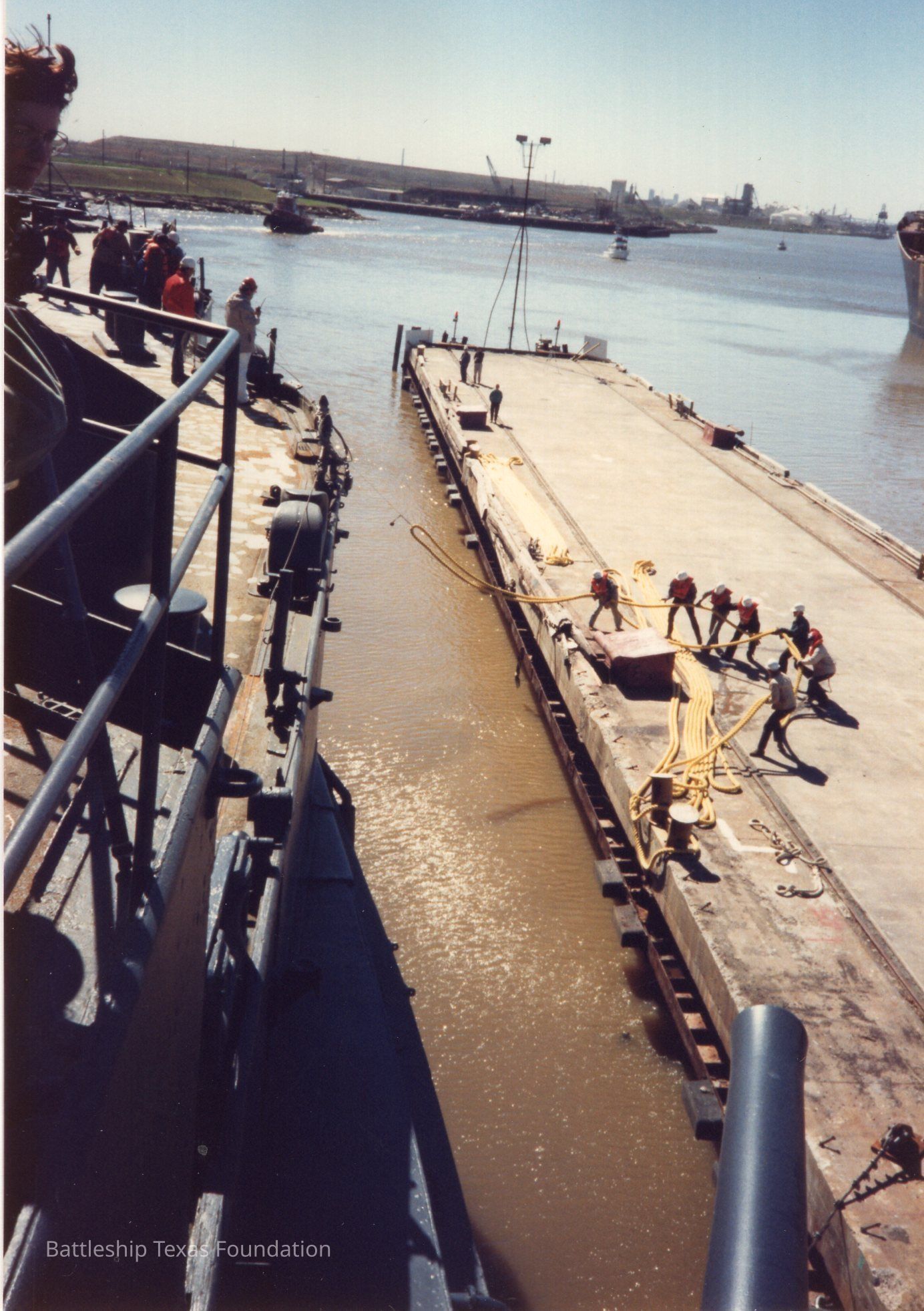 Mooring lines to the starboard of Texas are being fed up from the pier in Greens Bayou.