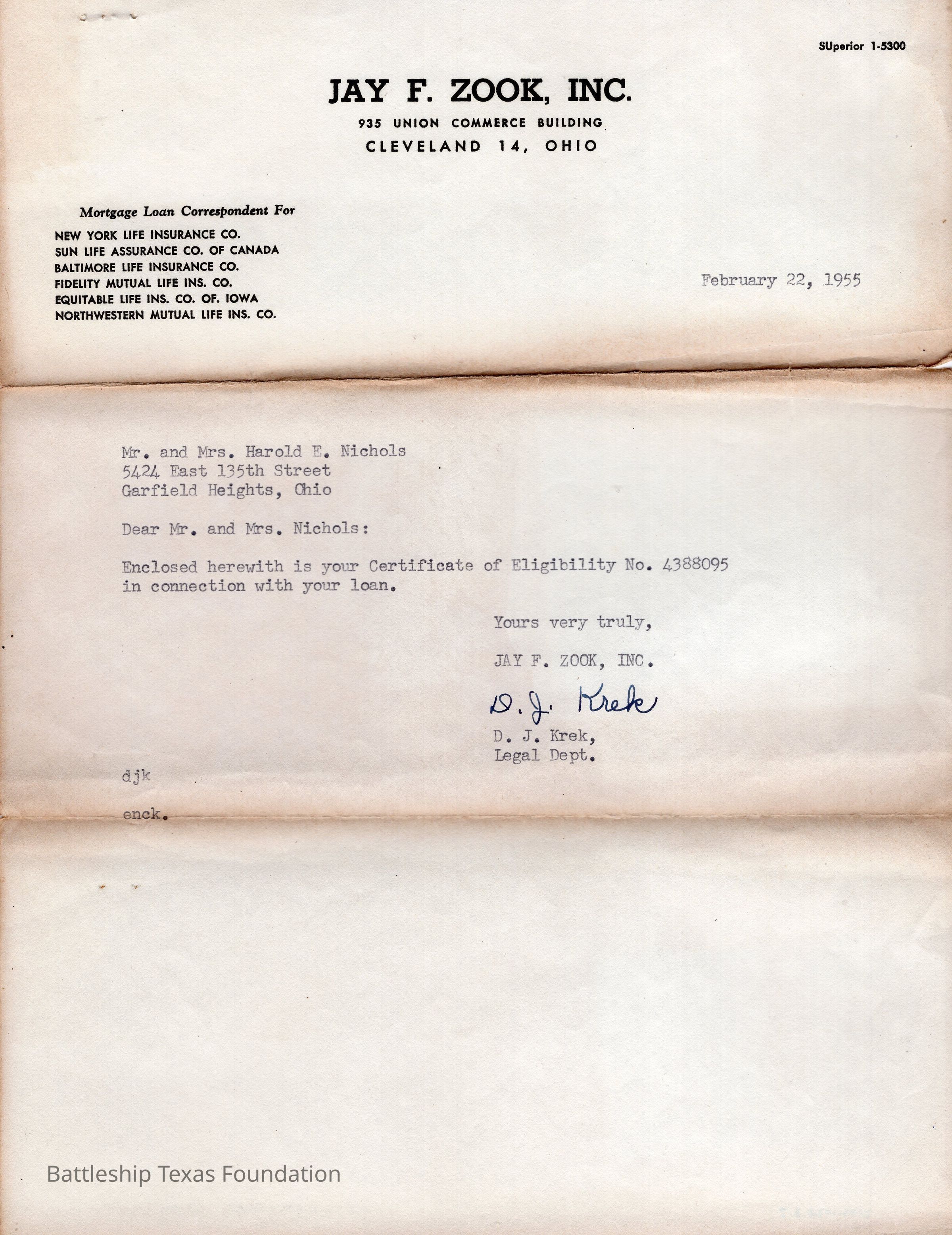 Notice sent to Mr. and Mrs. Harold Nichols that the Certificate of Eligibility was enclosed in connection with their loan.Context