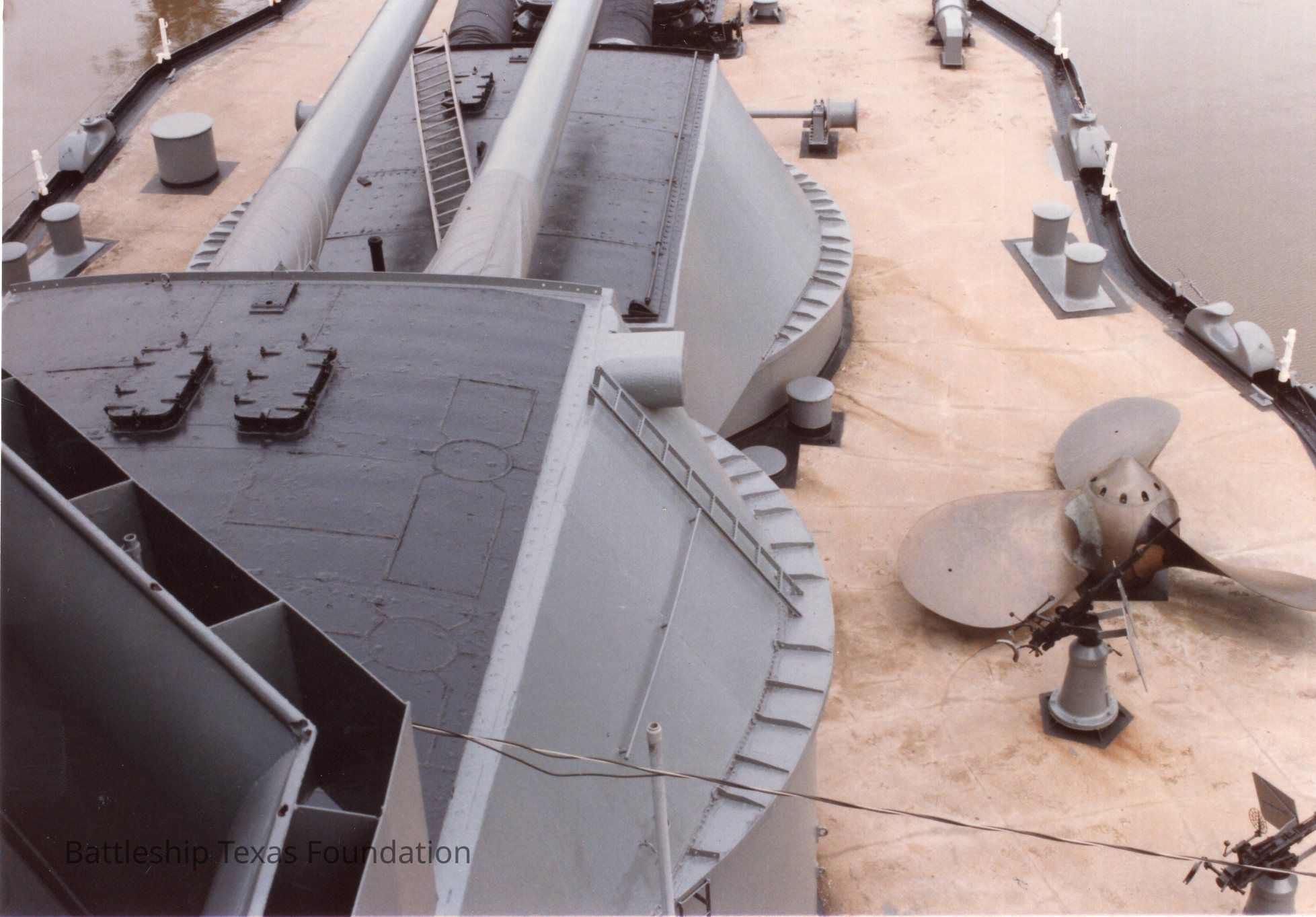 Shot from pilot house of the starboard forward main deck. Concrete deck visibly stained. Propellor screw resting on deck between turrets one and two.Context