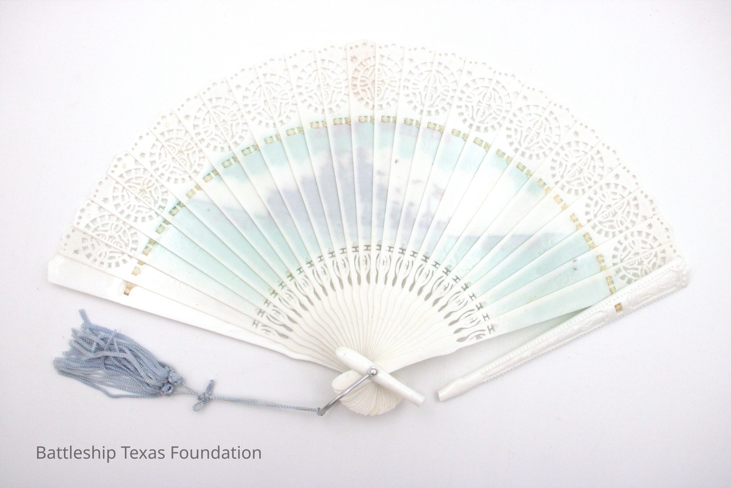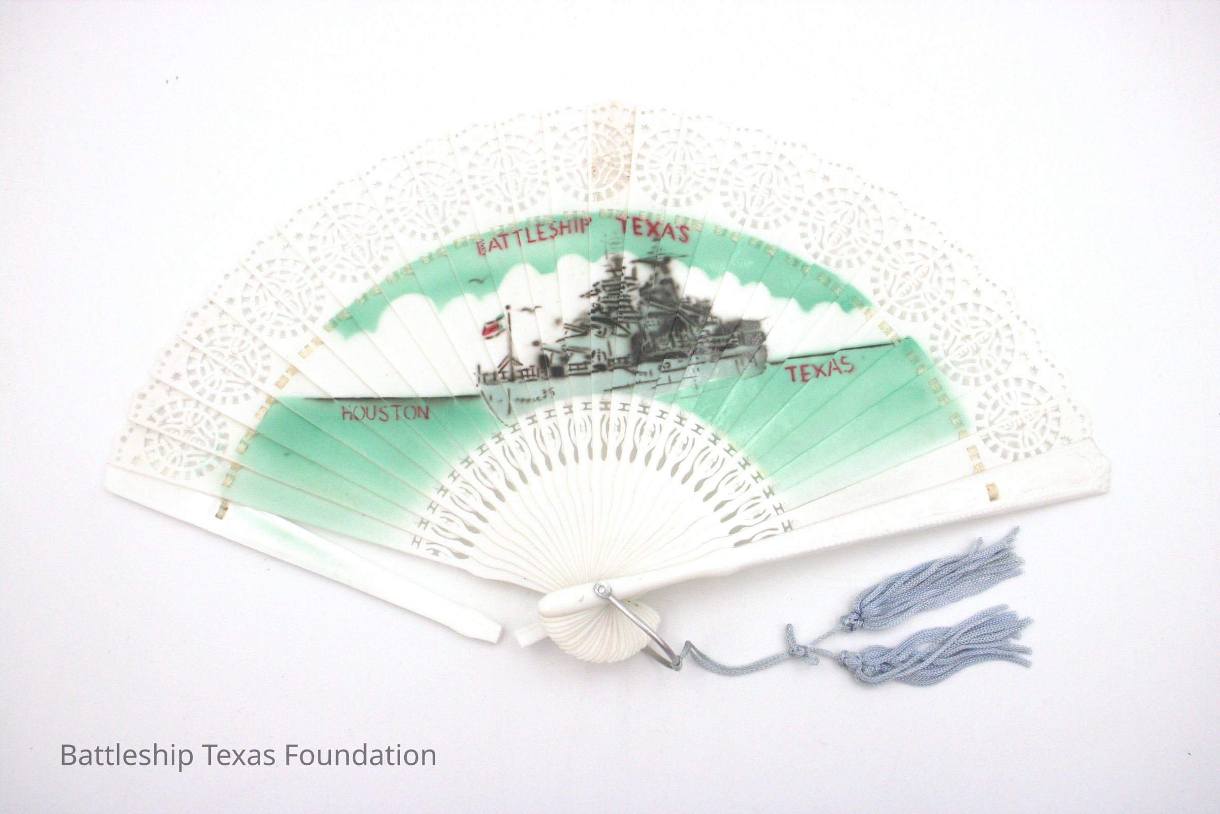 Souvenir fan made with image of Battleship Texas using gray and green.