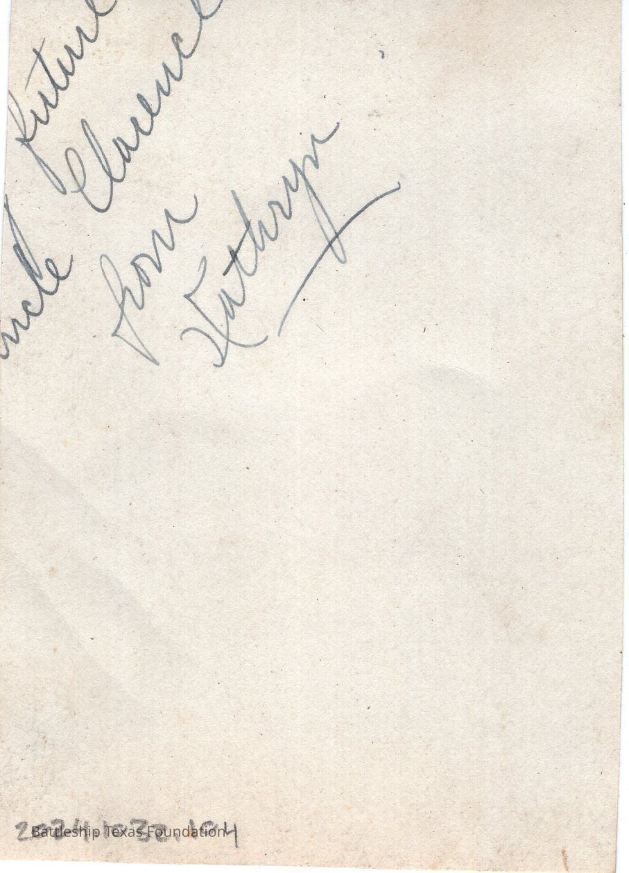 From a donated collection of individual photographs and pages out of a 1930s Texas crewmember's photo album. Items donated by the Los Angeles Maritime Museum. Many photographs had writing on the pages of the book, now discarded. The caption formerly on the page for this photo read, "MY PAL KATHRYN"