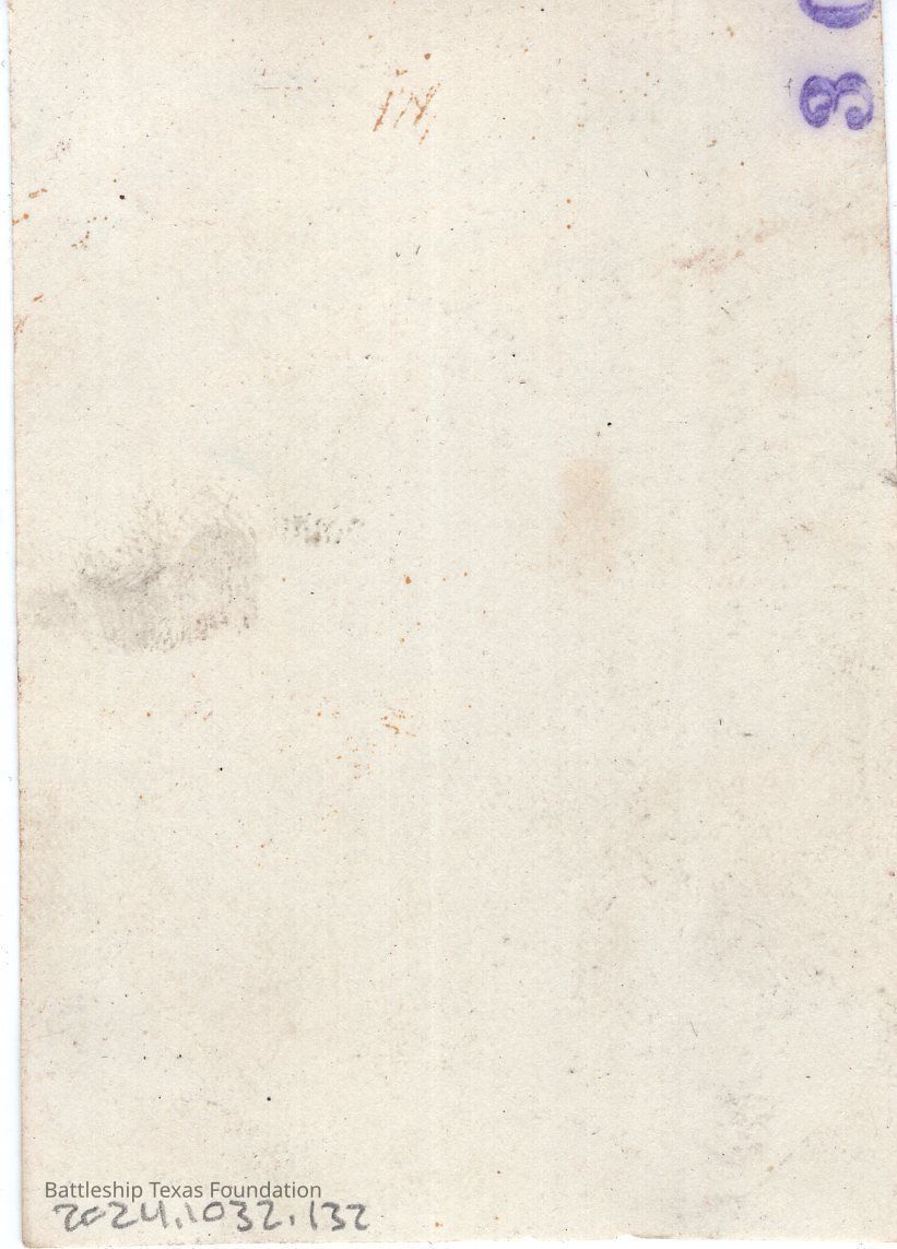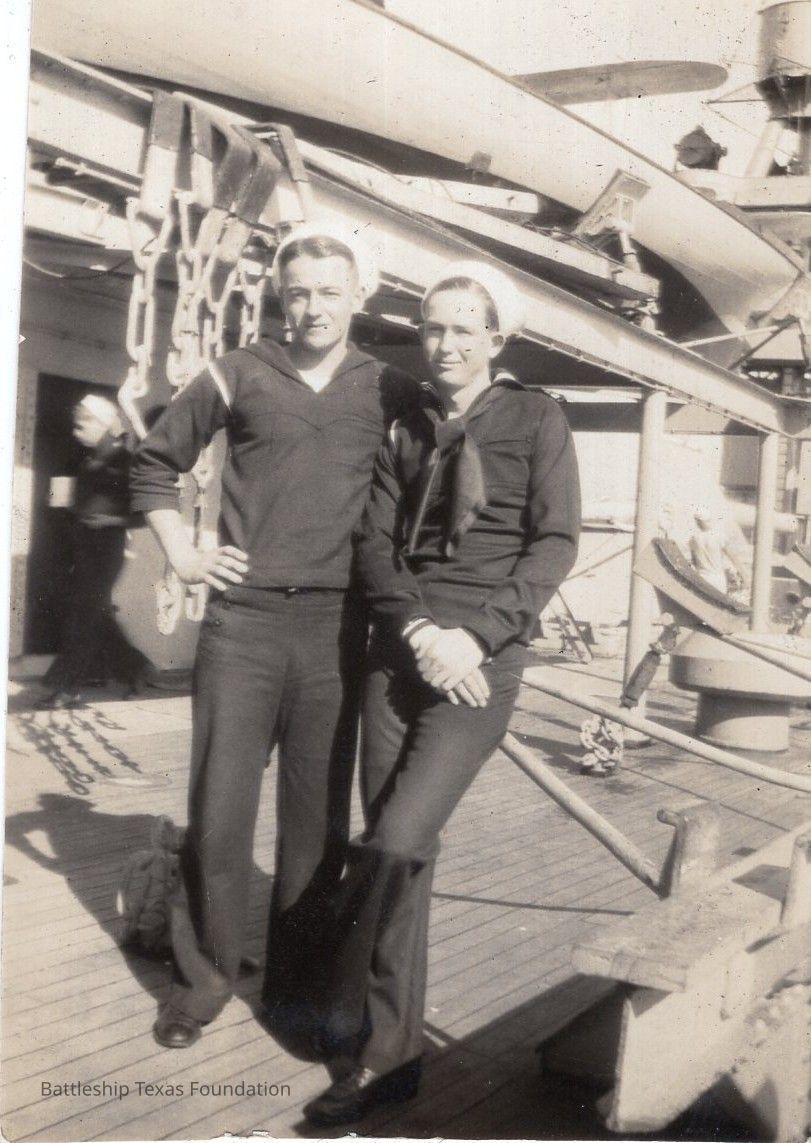 From a donated collection of individual photographs and pages out of a Texas crewmember's photo album. Items donated by the Los Angeles Maritime Museum. Many photographs had writing on the pages of the book, now discarded. The caption formerly on the page for this photo read, "Nall + Jay"