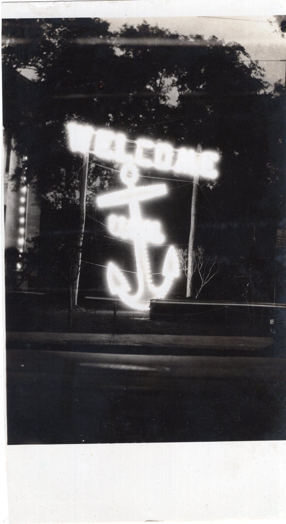 Photo of neon sign saying "WELCOME" with a fouled anchor below.Context