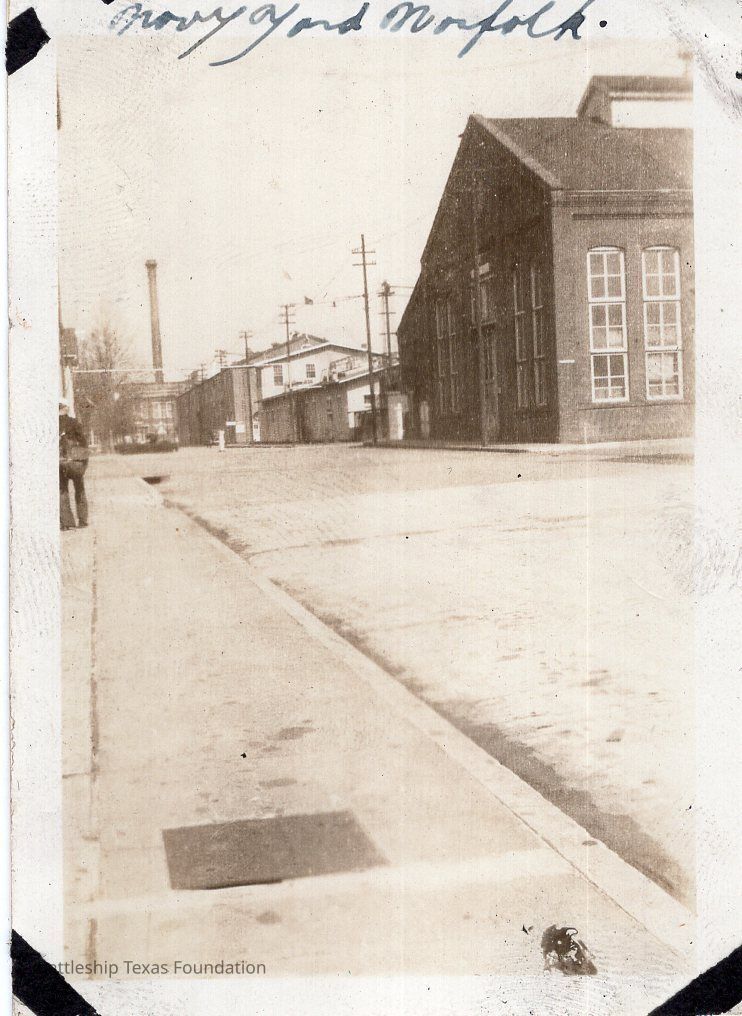 Features many buildings to the right of a cobblestone road. Captioned at top the same as in the book, “Navy Yard Norfolk.”Context